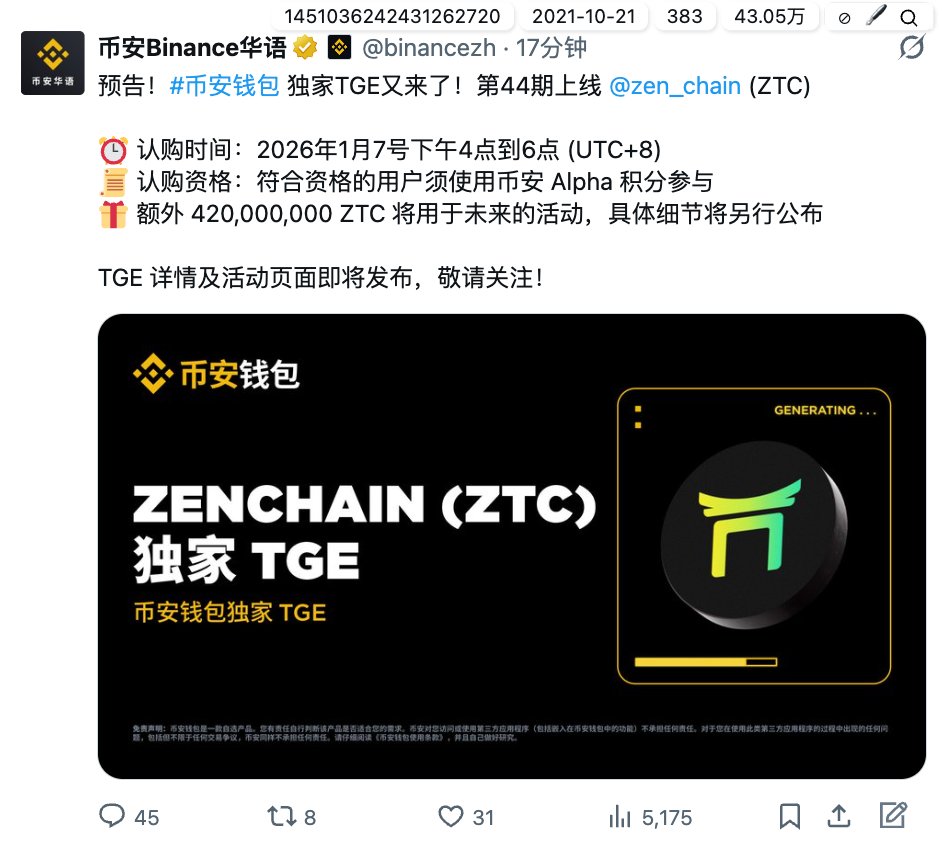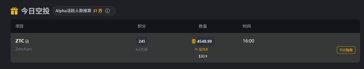 果不其然,这个 @zen_chain 今天TGE分数就是241分 昨天消一波高分目前来看也没啥太大作用。结果还是超募2500多倍,4549枚 $ZTC 差不多32U的样子当时。 现在这项目二线所也基本上的差不多了,现在FDV还是差不多37M的样子。原本我还以为会直接瀑布呢,倒是挺出乎意料的。 现在的alpha,普通散户要赚钱,其实赌死拿也是一种策略。之前在小群里提到过。 逻辑还是 既然这玩意儿都不太值钱,回本小赚意义不大,所以干脆领到的所有空投都死拿。只要有一个涨起来,超过50U以上,就能cover这个月的收益了。 比如前几天的 $COLLECT $BREV $RAVE 之类的。当然更多的是,死拿到最后值个几U 像 $ZEC 这种,就算TGE打完,扣掉损耗,其实和正常领一次空投的收益是差不多的。几个小时还没跌到十几U,已经算很稳的了...