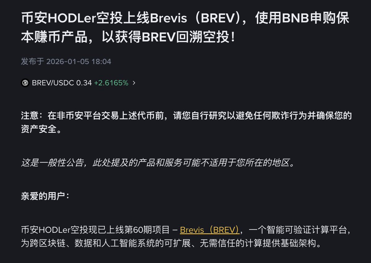 Binance HODLer 空投王炸🔥 $BREV 为什么大所抢着上? Binance 开年空投头牌 Brevis ($BREV) 杀疯了! ZK 赛道王者,Vitalik 多次转发,以太坊官推认证扩容未来,Binance Labs+Polychain 领投,这排面直接拉满🚀 🚀 核心实力: 痛点直击链上计算贵、无记忆、Gas 费高到离谱 解决方案ZK 协同处理器:省去复杂计算,仅将 ZK 证明回传链上验证 ✅ 以太坊扩容百倍 ✅ 全链历史数据秒调取 ✅ Gas 费降低 + 计算效率提升 VIP 交易系统、动态借贷等… 现在直接一键落地 交易所抢跑:上线 Binance 现货后登陆各大交易所。 💰 代币模型 + 空投玩法,躺赚机会别错过 代币良好度拉满:10 亿总量,32.2% 砸向社区激励! 团队 + 投资者锁仓 1 年,抛压≈0 空投参与超简单:12.17-12.20(UTC+8)用 $BNB 买保本 / 链上赚币产品,直接领回溯空投 交易赛加码:Binance $BREV 交易赛,瓜分 400 万枚代币🎁 💎 长期看好: Prover 节点质押 $BREV 接单赚钱,质押越多 = 能接复杂的高利润任务 所有 ZK 服务都要用 $BREV 支付证明费 未来迁移至自研 Rollup,$BREV 直接变 Gas Token!交互 / 证明 / 结算都可以。 BNB 金铲子无疑,一鱼多吃错过拍断腿! #Brevis #ZK #Binance #Ethereum #CryptoAirdrop @brevis_zk @binance @binancezh @moonkimbinance @yayabinance