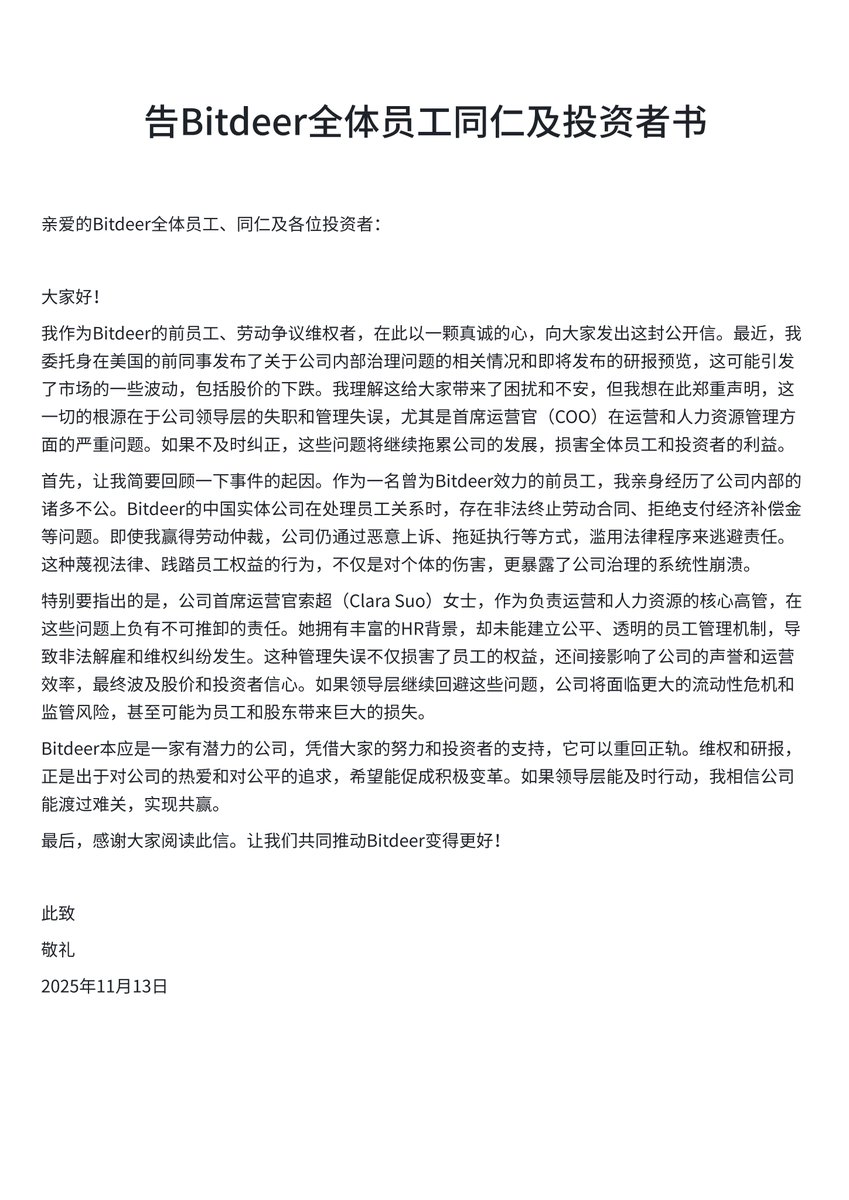“ $BTDR 的中国大陆主体公司(北京非尘科技有限公司)非法裁员并拒绝支付赔偿金。在我们的成员赢得劳动仲裁后,该公司竟滥用司法程序,通过不断上诉(一审、二审)来恶意拖延执行,拒不支付。”