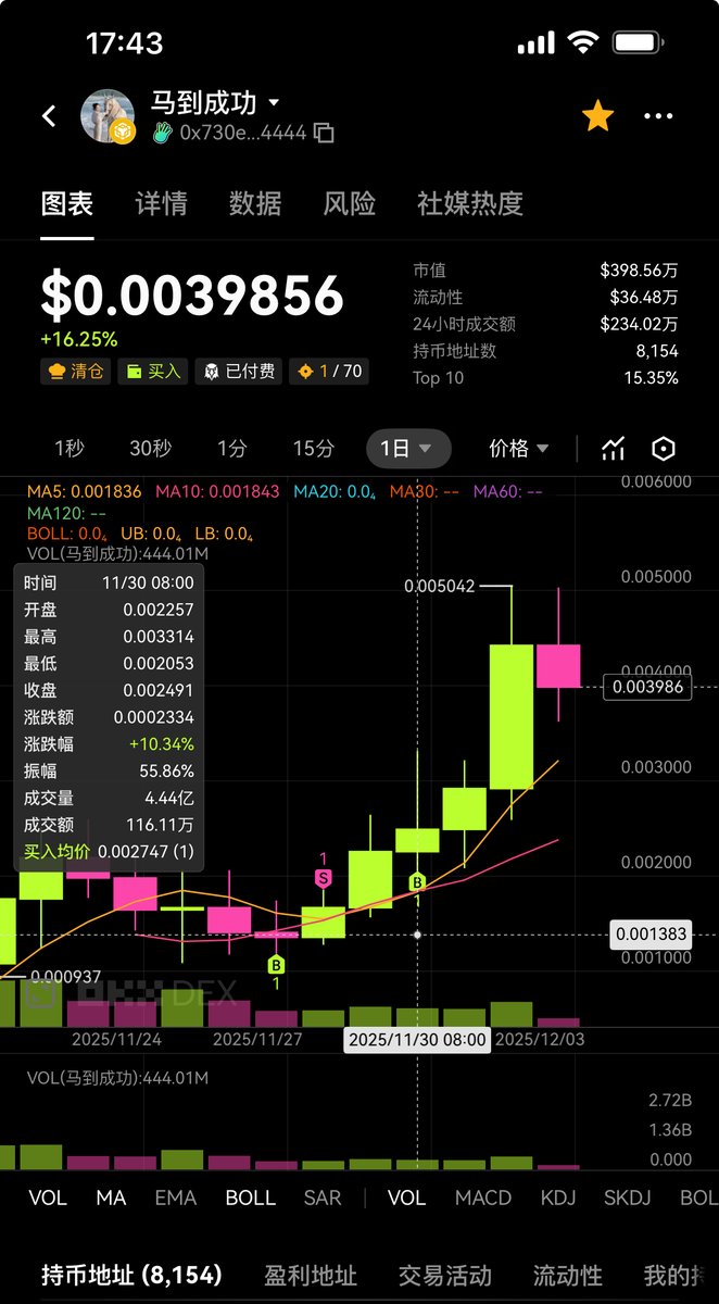 我在 $bibi 和 $马到成功 分别在250万左右的位置时候 在群里 亲自指挥 亲自部署 执行贯彻了以巴子为首的逢低买入策略+双标的各买一半策略 大获成功 事实证明 逢低买入策略+双标的各买一半策略的战略部署是充满了前瞻性和正确意义的 这种伟大的战略部署将使我在以后的炒币进程中 无坚不摧无往不利战无不胜
