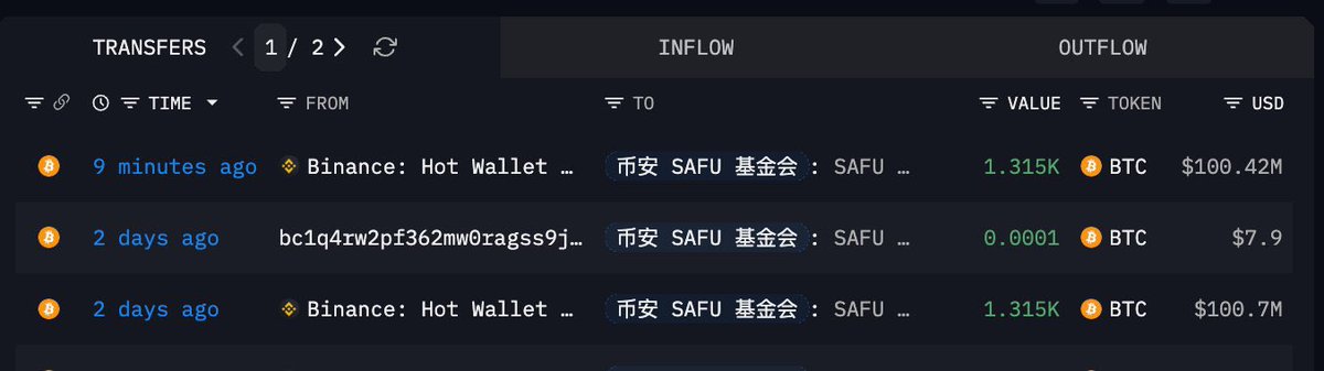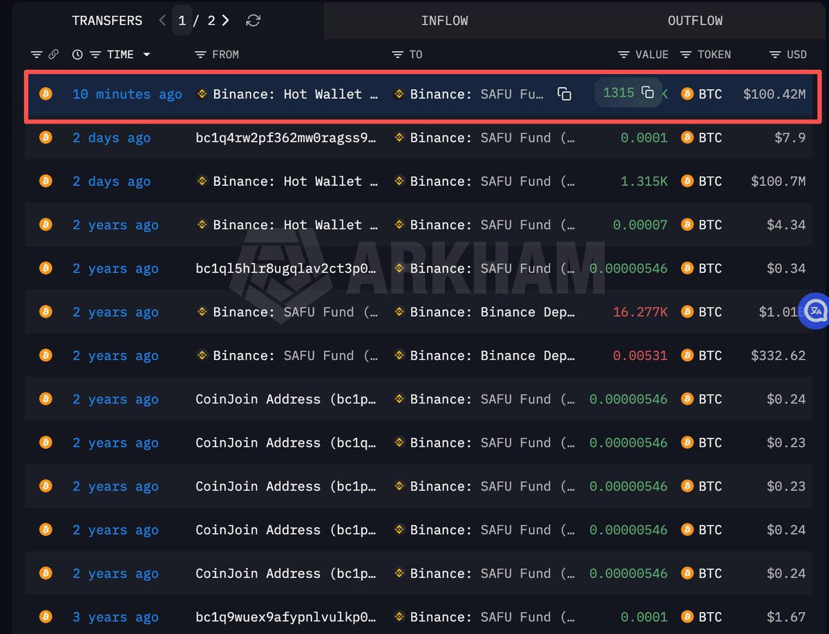 Binance SAFU 基金地址再次转入 1315 枚 BTC,时隔两天又一次买入;10 亿美元救市计划,进度已达 20%