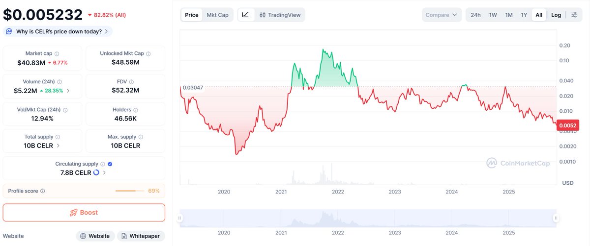 最关键的发现: $CELR 币价的历史最高点出现在 2021 年 9 月末,也就是 TGE 两年之后。