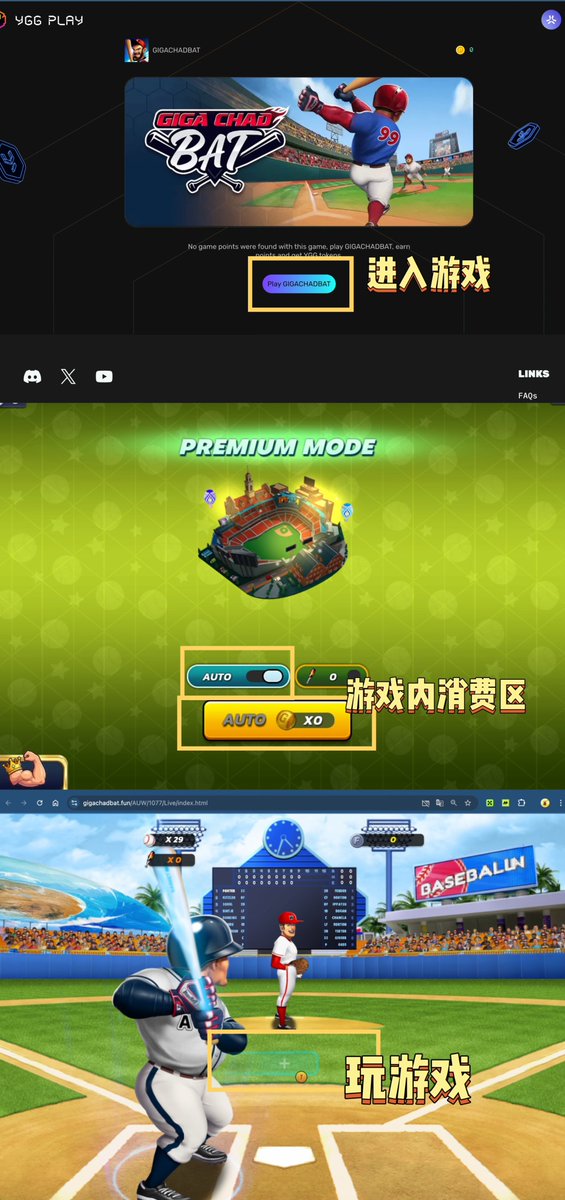 💚Abstract上的打棒球游戏 @GIGACHADBAT 2月初TGE! ⚾为期14天的淘金热正在进行,一起本垒打! 👉游戏背景: 创始团队是 @delabsOfficial 经验非常丰富的小游戏工作室,之前在KAIA上玩过他们拳击的同学们应该有所了解,这次是打棒球! 项目获得了 @YGG_Play 的支持,YGG作为从2021年活跃到现在的游戏公会,筛选项目非常苛刻。更加上游戏是在当前游戏链TOP1的ABS上,所以决定参与一把! 👉当前活动:14天淘金热 从1月21日 - 2月3日,为期14天的淘金热就是让玩家通过游戏获得代币空投,时间周期短,没有那么卷,很快就能看到结果。 本次活动的奖励占总代比供应链的5%(整个P2A模块一共10%),类似DeFi的头矿。而且根据官方消息,活动结束之后他们的代币 $CHAD 立刻TGE。 ✅游戏内的排名根据累计消费金额。玩游戏可以获得积分+XP,实测XP相对ABS其他项目给的比较多;而积分可以换取 $YGG。排行榜排名在TGE的时候会被空投 $CHAD,当前消费按照2倍计算,助力冲榜! ❗参与活动有120u消费门槛,用于过滤大部分的女巫。实测你至少消费123.6u(球+棒),但是有 $YGG 补贴,根据别的玩家的战绩10000积分 = 1u,综合磨损20%。所以低保号大概是30u-40u成本,不能自动打要手动。 👉游戏玩法 1. 进入游戏【🎮 https://t.co/dmihh5LfOi 】 2. 可以先在免费版本玩一玩练练技术,然后进入右下角PERMIUM 3. 一定要点左下角的Opt - In才算加入淘金热 4. 在商城里购买球和棒,然后开始游戏 5. 游戏过后可以有一次翻牌子的机会让你的积分翻倍或者损失,个人建议不要翻,我没中过。积分可以换成 $YGG 代币在右上角 ❗投资有风险,本文提到的项目和代币不构成直接的投资建议,Web3所有项目都有概率让你损失所有本金,任何项目本质都是博弈,各位评估好风险。