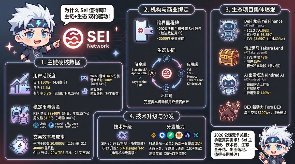 相信大家这段时间都看到了,很多伙伴包括我都在深度建设SEI,然后就有很多小伙伴肯定比较好奇,为什么 Sei Network @SeiNetwork值得蹲? 最近刚好没什么事,时间多,就来简单和大家聊一下吧,感兴趣的可以停下脚步看看: 可能有伙伴觉得我是因为 Yei @YeiFinance的 $CLO 从 0.153 涨到 0.92(6 倍涨幅)这种短期行情,其实不是的,而是我盯了大半年,发现不仅 Sei 主链的每一个进展都有实打实的数据支撑 连生态里的各类项目都在集体爆发,这种 “主链 + 生态” 双轮驱动的态势,远比单一项目暴涨更有说服力,长期价值或许更高 先上主链硬核数据吧:每一个数字都藏着真实需求的 一:【用户活跃度】: 日活地址稳定在 150 万以上,4 个月直接翻倍; 月活逼近 14.4 百万,总独特地址更是冲破 8900 万!关键不是数字多,而是质量高 —— 参与率(DAU / 总钱包)约 0.9%,远超 ETH 的 0.29% 更狠的是 Web3 游戏赛道,拿下 34% 市场份额,远超 Ronin,光游戏钱包就有 880 万,还在以 74% 的速度增长,没有过硬的底层性能,根本是扛不住这么高频的交互的 二:【稳定币与资金】: P2P 稳定币供应飙到 7840 万美元,创历史新高,年增长率高达 157% 周稳定币交易量突破 1.5 亿美元,3 个月就涨了 104% 稳定币结构也很全面:Circle 原生 USDC 占比 86%+(合规兜底),PayPal 的 PYUSD 接入(打通 2.5 亿用户),还有 Ondo 的 USDY(收益型,适配 RWA),不管是机构还是散户,都能找到适合自己的类型 三:【交易效率与成本】: 平均一笔交易手续费才 0.00003 美元,算下来 2.5 万笔交易才花 1 美元,比大多数 EVM 链便宜 30 倍,比 Sui 便宜 10 倍,确认速度更快 现在已经做到 400ms 最终性,点完就到,后续 Giga 升级测试已经达到 20 万 TPS,目标是实现 “永不暂停的 24/7 市场”,体验跟支付宝、Visa 差不多一样 四:【机构与商业绑定】: 跟一家头部手机品牌的跨界合作更是里程碑级 ——2026 年起,该品牌全球新款手机(不含部分地区)将预装 Sei 的 Web3 钱包,用主流账号就能一键登录,直接触达数亿潜在用户,还设了 500 万美元基金资助手机端应用开发,这是要把生态铺到普通用户手里了 再看生态项目:不是单点爆发,是全赛道集体亮眼Sei 生态最牛的地方,就是没有 “一家独大”,而是 DeFi、AI、LSD、游戏等多个赛道齐头并进,每个领域都有拿得出手的标杆项目,数据和落地进度都很扎实 五:【DeFi 龙头:Yei Finance @YeiFinance】: 作为生态 DeFi 发动机, $CLO 近 7 天冲进全市场涨幅前三,不仅代币涨了 6 倍,真实 usage 更硬核 ——YeiSwap+YeiBridge 累计交易量超 6.85 亿美元,用户不只是存钱吃息,而是真的在换币、跨链。 它的 TVL 也冲到过 3.65 亿美元,占 Sei 生态 60% 以上,核心架构 Clovis 让一笔存款同时赚借贷利息、交易手续费、跨链奖励,资本效率直接拉满了 六:【借贷黑马:Takara Lend @TakaraLend 】: 作为生态 TVL 排名第一的原生借贷协议,表现也丝毫不输 Yei,一个季度 TVL 飙升 48%,独立用户直接破 8 万,现在还在积分积累阶段,赛道拥挤度低,是很多老玩家悄悄布局的潜力股之一了 七:【AI 出圈候选:Kindred AI @Kindred_AI】: 这可能是 Web3 最接近 “消费级” 的 AI 应用,把天线宝宝、Hello Kitty 等顶级 IP 做成链上 AI 伴侣,依托 Sei 的高性能实现秒级语音响应 数据也不错:Warner Bros 合作项目用户人均日使用 6.2 小时,Axie 试点 30 天留存率 52%,等待列表突破 740 万人 —— 一旦这些用户转化,将给 Sei 带来很多的流量 八:【DEX 新势力:Toro DEX @torodex_xyz】: 作为生态里的新锐 DEX,单月交易量已经突破 100 万美元,虽然规模不算最大,但增长势头迅猛,依托 Sei 的低费和高吞吐,也是正在快速抢占市场份额 技术升级:敢做减法才是真聪明,为生态爆发铺好路很多人没看懂 Sei 的 SIP-3 提案,觉得 “删代码” 是退步,其实这才是最关键的一步棋 Sei 要在 2026 年年中彻底砍掉 Cosmos 架构,变成纯 EVM 链,这一下直接解决了主链和生态的双重痛点: 对机构和项目方来说,之前要适配 EVM+Cosmos 双架构,托管、审计、风控工具链都得做两套,成本极高;现在只剩 EVM,接入成本陡降,相当于给所有生态项目开了 “绿色通道”,吸引更多优质团队入驻 对用户来说,再也不用在 Cosmos 地址(sei1...)和 EVM 地址(0x...)之间切换,资产管理简单多了 而且并行 EVM 的性能优势更突出,处理超大规模交易时不会卡壳,不管是 Yei 的高频 DeFi 操作,还是 Kindred 的 AI 实时交互,都能流畅运行,就像把 “分段限速的国道” 改成 “不限速高速” 重头戏就是 Giga 升级,现在测试已经达到 20 万 TPS,目标是 5.4 gigagas/sec,等落地后,Sei 的性能会再上一个台阶,完全能承载机构级的高频金融需求和大规模消费级应用 生态协同:不是各自为战,是互相输血的闭环Sei 生态最核心的竞争力,是这些项目形成了 “谁也离不开谁” 的结构性依赖,构成了完整的资本流动和用户流转闭环: 资金端:BlackRock、Apollo 等机构的 RWA 资产通过 KAIO 代币化后进入 Sei,Circle 原生 USDC、PayPal PYUSD 提供稳定资金池,再通过 Kryptonite 的 LSD 协议释放流动性,为 DeFi 项目提供弹药 应用端:Yei Finance 整合借贷、交易、跨链,让资金能高效赚多重收益;Monaco 提供共享订单簿,解决了 Yei 等项目的滑点问题; Takara Lend 承接小额资金需求,覆盖长尾用户; Kindred AI 则负责拉新破圈,把圈外用户转化为 Sei 生态的忠实用户,再导流到 DeFi、游戏等场景 出口端:通过上述头部手机品牌预装的钱包,用户能直接用链上资产在该品牌全球 2 万多家线下门店消