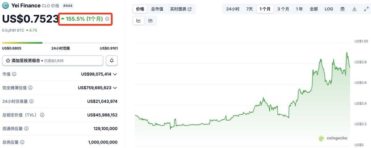 这两天看到了 @SeiNetwork 生态的@YeiFinance代币 $CLO 在底部$0.153到最高$0.92附近,涨了6倍多。我认为这与 $sei 在2025年的升级和不断进化有很大的关系,也不辜负我在社区一直让大家关注 $sei 生态。 之前写过很多推文,介绍 $sei 的Market Infrastructure Grid,大部分人都认为它TO B的意图要比TO