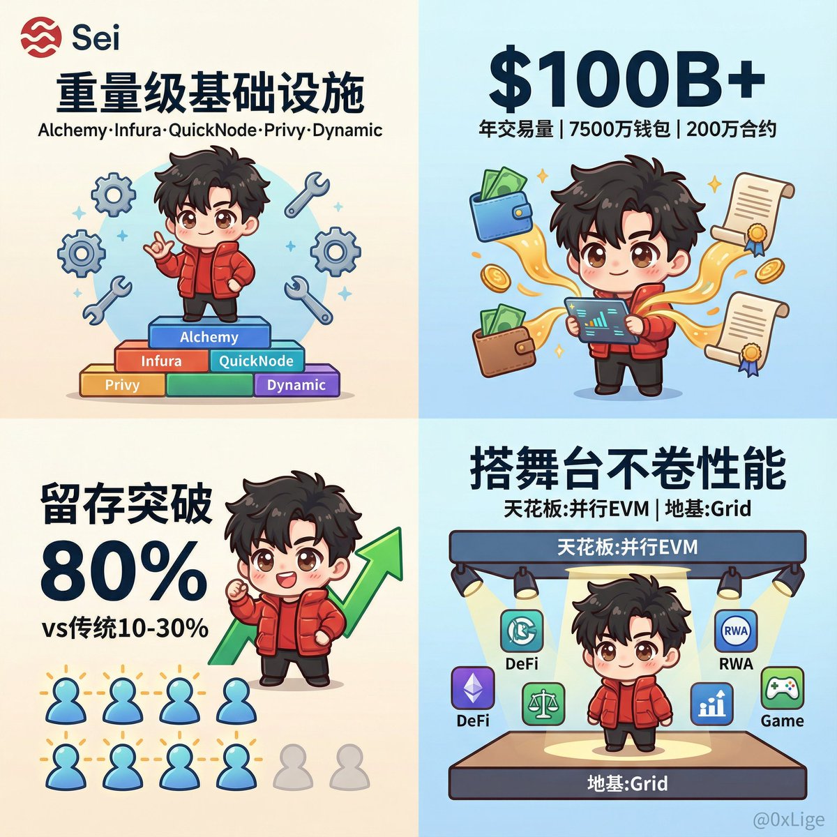 看了Sei @SeiNetwork 最近的基础设施布局,我发现一个很有意思的现象。 大家都在谈 TPS、谈并行 EVM,但其实大多数链上应用不是死于性能不够,而是死于两个更实际的问题:基础设施配置太复杂,用户引导体验太烂。 Sei 这次把 Alchemy、Infura、QuickNode、Privy、Dynamic 这些重量级基础设施全部拉到位,本质上是在解决一个系统性问题: 让开发者能在第一天就把产品跑起来,让用户能用邮箱或社交账号直接登录,不用再经历下载钱包-助记词-Gas费这套劝退流程。 数据很直观:这些基础设施支撑着每年 1000 亿美金以上的交易量、7500 万个钱包、200 万份智能合约。这不是空谈技术,而是真实的使用量。 更关键的是用户留存率的改善。传统 Web3 的用户引导流失率高达 70-90%,而嵌入式钱包能把这个数字压到 20% 以下。 意味着你做一个应用,10 个进来的用户能留住 8 个,而不是只留住 1 个。这才是真正的可用性突破。 Sei 现在的定位很清晰: 它不是在卷性能,而是在搭舞台。并行 EVM 是天花板,Grid 基础设施是地基,真正的演员是那些 DeFi、RWA、游戏应用。 我个人角度来说,这不只是技术升级,更像是给开发者们开了个后门。以前建DApp,总得纠结链的性能和兼容性,现在用熟悉的RPC、测试工具,直接无缝迁移到Sei #SEI
