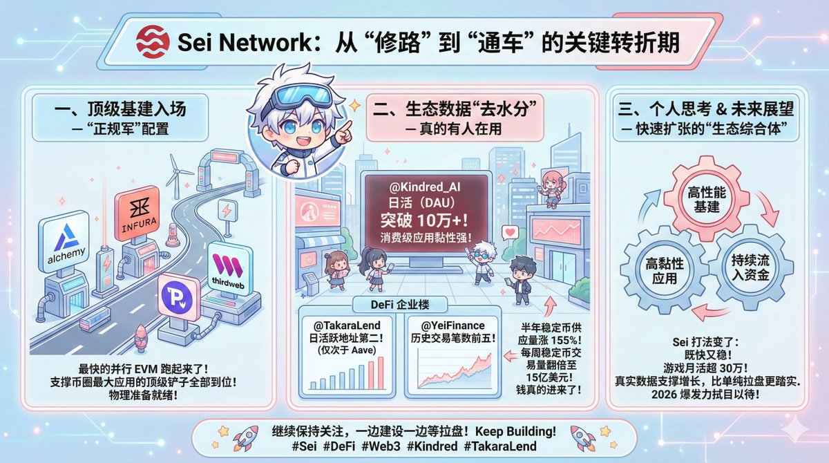 今天似乎安静了很多,刚好来复盘一下公链数据了,复盘期间发现 Sei @SeiNetwork的走势挺有意思的 不同于很多还在画大饼的链,Sei 给我的感觉是正在经历从“修路”到“通车”的关键转折期,有空的小伙伴可以停下脚步一起来看看: 今天我主要从基础设施(地基)和链上活跃度(人气)两个方面,和大家拆解一下现在的 Sei 到底走到哪一步了! 一、 顶级基建入场,这是“正规军”的配置 以前我们看新公链,最担心的就是开发工具不好用,开发者不愿意来,但最近 Sei 把这一块彻底补齐了 Alchemy、Infura、Privy、Thirdweb…… 熟悉开发的朋友都知道,这些名字意味着什么 Infura 是小狐狸钱包(MetaMask)背后的引擎 Alchemy 支撑着 OpenSea 和 World Chain 每年千亿美金的交易量 Privy(最近刚被 Stripe 收购)更是连接了 7500 万+ 的钱包用户 现在这些支撑着币圈最大应用的“顶级铲子”,全部都在 Sei 这个最快的并行 EVM 上跑起来了,这就好比把高速公路修好了,还配上了最好的加油站和服务区,为接下来的大规模应用爆发做好了物理准备,这也是大家理解了吧? 二、 生态数据“去水分”,是真的有人在用 基建再好,没人玩也是空城,但 Sei 最近的数据,说实话,挺硬核的,而且它不是靠某一个盘子死撑,而是多点开花: 消费级应用杀出来了: @Kindred_AI 的日活(DAU)已经突破 10 万+,注意是日活,不是月活,在 Web3 做消费级产品能有这个黏性,非常难得了吧? DeFi 正在追赶老大哥:@TakaraLend 现在的日活跃地址数已经是 EVM 借贷协议里的第二名了,仅次于 Aave,这个含金量大家可以细品一下,就不多说了 @YeiFinance 的历史交易笔数也冲到了 EVM 借贷协议的前五了,钱真的进来了,而且它的代币 $CLO 最近也是稳步上升! 最近半年,Sei 链上的 P2P 稳定币供应量涨了 155% 最近三个月,每周的稳定币交易量翻倍,达到了 15 亿美元 三、 我个人的一点思考,这波复盘下来,我的感觉是: Sei 的打法变了,以前可能大家觉得它快,现在它是在证明自己既快又稳 一方面用 Alchemy 和 Privy 这种顶级基建稳住开发者体验,另一方面通过游戏(11款游戏月活超30万)和 DeFi 的实际数据留住用户 高性能的基建 + 高黏性的应用 + 持续流入的资金,这三个齿轮一旦咬合起来,转动的速度会非常快 现在的 Sei,不再是单打独斗,而是一个正在快速扩张的“生态综合体”,对于我们这种看长线的玩家来说,这种有真实数据支撑的增长,比单纯的拉盘更让人踏实,币价只是时间问题,别全身心都在上面,一边建设一边等拉盘,这不好吗,哈哈哈 继续保持关注,看看 2026 它的爆发力吧!一起拭目以待! #Sei #DeFi #Web3 #Kindred #TakaraLend