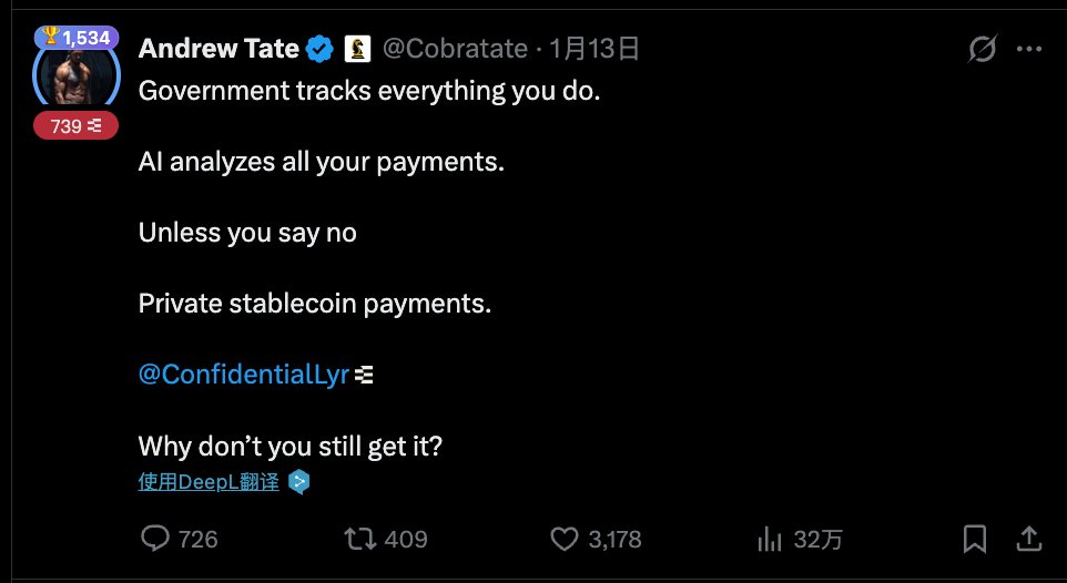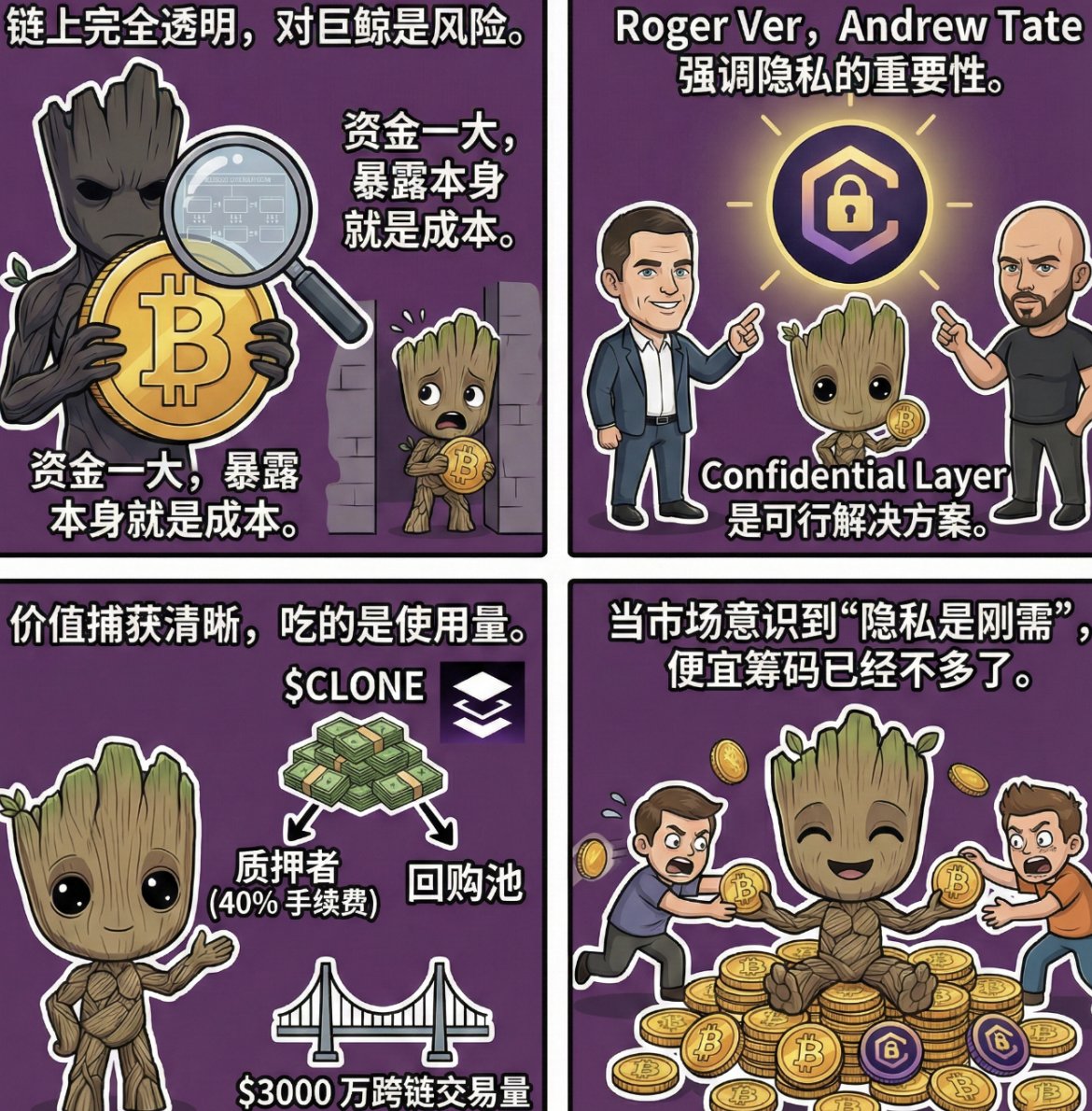 大家有没有发现最近一段时间,真正的大资金,开始重新严肃地讨论“隐私”了,不是散户口嗨,也不是叙事轮动,而是那种一旦动手,基本不会发推解释的巨鯨群体。 现在越来越多的高净值用户对「可验证但不可追踪」的需求正在变得非常现实,也正是在这个背景下Confidential Layer 被频繁点名。包括 Roger Ver,以及 Andrew Tate 最近的公开表态,都在反复强调同一件事:下一阶段的加密基础设施,隐私不是选项,而是前提。而他们给出的解决路径,指向的正是 @ConfidentialLyr ,而@Cobratate也在推文里明确提到私人稳定币支付这个方向。 如果你从市场结构看,会发现一个典型的“错位阶段”。大户已经在场内,但大众几乎还没意识到发生了什么。 $CLONE 早期经历过一次非常标准的空投后抛压:老用户兑现、流动性释放、价格回落,这一步并不意外,但也恰恰是多数人忽略基本面的时候。 从链上行为来看,筹码并没有继续大幅外流,反而在低位逐步被吸收,结构开始重新稳定。当一个隐私协议在“没人讲故事”的阶段,还能持续看到资金与使用量同步增长,这本身就是一个值得认真对待的信号。 但是真正让我开始重估 $CLONE 的,不是情绪,而是机制与数据开始对齐。@ConfidentialLyr 并不是抽象的“隐私叙事”,它的定位非常明确:隐私稳定币与跨链的基础设施层。这意味着代币并非只靠共识溢价,而是与真实使用挂钩。 目前协议结构里,有几个关键点非常值得注意: 协议手续费中 40% 分配给质押者,并伴随官方定期市场回购 上线以来,约 25% 的流通供应被锁定质押 最近一个月跨链交易量约 3000 万美元,MoM 增长超 70% 这不是短期拉盘数据,更像是产品被反复使用后的自然结果。结构上也很有意思:低价阶段,你拿的是偏收益属性(质押年化);高价阶段,更多体现为资本利得。这是一个对长期持有者非常友好的对冲型设计。 再往前看一层,潜在变量其实还没完全定价: 目前尚未登陆 Tier 1 交易所 主流钱包整合仍在路线图中,一旦落地,触达的将是千万级用户 隐私稳定币若成为刚需,CLONE 的价值捕获将直接与使用量绑定 这类项目往往不是靠“喊出来”的,而是在你回头看的时候,已经走完了最安静、也最关键的一段。我不会说这是一个“马上起飞”的标的,但如果你在关注 隐私 × 稳定币 × 基础设施 这条线, $CLONE 现在所处的位置,至少值得放进你的观察清单,而不是等情绪来了再追。因为真正的大行情,往往发生在没人急着讲故事的时候。