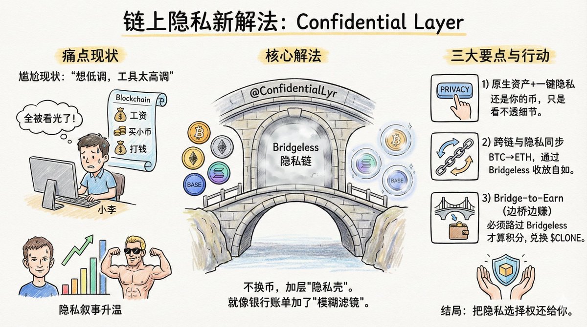 我有个在交易所上班的兄弟小李,白天做合规,晚上回家就当“链上侦探”。 最爱干的事,就是去各种地址分析网站八卦别人的钱包。 有天他顺手查了一个大 V,一路顺藤摸瓜,把人家: 什么时候梭哈小盘币、给哪个项目打过钱、哪段时间在发工资,扒得一清二楚。 他一边笑一边感叹:“这人一生都写在链上了。” 笑完又愣住:“要是别人这么查我,不也一目了然?” 这就是现在大部分链上人的尴尬: 钱包是 BTC、ETH、SOL、Base 这些熟悉的公链资产, 想要隐私,又不想重学一套“隐私币世界”,就卡住了。 @ConfidentialLyr做的事就一句话: 让你不用换币,就能给 BTC、ETH、SOL、Base 这些资产,加一层“隐私壳”。 你可以把它当成一座“为隐私定制的跨链桥”: 还是原来的币,只是先桥进隐私网络,外面看不清你的细节路径; 想回公链,再从隐私网络桥出来,用起来跟普通跨链差不多; 对撸任务、打赏、分润、团队资金、安静持仓这些场景都更友好,不用把自己所有链上习惯摊开给别人看。 更现实的是,它还把“桥资产”本身做成了活动:Bridge-to-Earn: 用官网连接好钱包; 按要求走带 Bridgeless 的桥接路径; 桥得越多,CL1 积分越多,TGE 时换 $CLONE 代币; 桥接费用的 40% 会分给质押 $CLONE 的人,协议收入跟社区绑在一起。 行动步骤也很简单: 1)打开活动页面:https://t.co/QXBhJ3SV0u 2)点“开始赚取”,把基础任务做完拿初始积分; 3)进「CL BRIDGE」开始桥,把部分仓位先走一遍隐私网络; 4)后面有新任务就顺手补,等 TGE 和空投细则公布。 链上透明不是问题,但所有东西太透明,就是问题。 Confidential Layer 做的不是让你“消失”,而是给你多一个选择: 什么公开给市场看,什么只在自己和协议之间悄悄流动