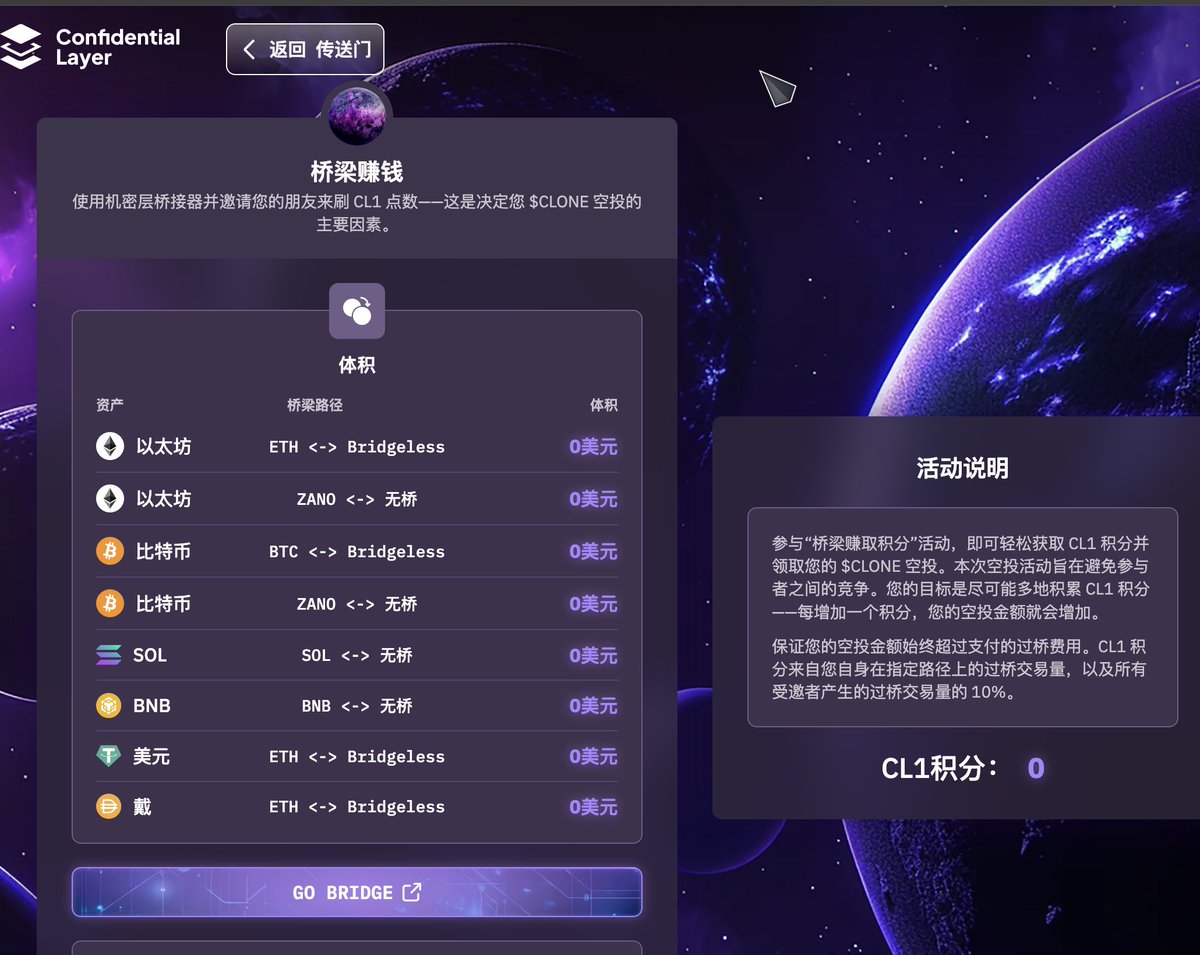 最近隐私这个话题真的又被点燃了。ZCash 从 5.5 亿直接冲到 100 亿,。熊市大多数赛道熄火的时候,反倒是隐私越走越热。 @ConfidentialLyr 它不是发隐私币,也不是让你换链,而是让你直接把 BTC、ETH、SOL、Base 这些资产“一键变隐身”。币还是你的那个币,只是多了一层隐私保护。理解成专门为隐私打造的跨链桥也没问题,流程很像 LayerZero/Wormhole,但方向完全不一样。更方便的是,它已经接入了 https://t.co/r7bObXvAYY 这种大钱包,点两下就能直接转到隐私网络里。桥接费还有 40% 会分给 $CLONE 的质押者。 现在他们在做 Bridge-to-Earn 活动,如果你想拿 $CLONE 的空投,这轮就是主线任务。参与方式很简单,手把手教学: 想赚 $CLONE 空投?这轮的主线任务就是: 通过桥接来刷积分 → 积分以后换空投步骤很简单: 1️⃣ 打开这个: https://t.co/tmupIeFkwD 2️⃣ 点击“开始赚钱”,先把基础任务做了 3️⃣ 进去点“CL BRIDGE”,开始桥 4️⃣ 桥多少你说了算,积分按你桥的量走 桥接产生的费用有 40% 会返还给 $CLONE 的质押者。 🤔特别提醒: 桥接路径里必须出现 Bridgeless,不然系统不算积分。ETH → Bridgeless、TON → Bridgeless 这些都算;Bridgeless 回到 ETH/TON/Zano 也算。只要绕过 Bridgeless,就算桥了也不给积分。 如果你想提前锁住这波空投,趁桥便宜、竞争小,现在就能上手撸积分。 官方链接我也放下面: X: @ConfidentialLyr 网站: https://t.co/0JqlvdJdnB 使用指南:https://t.co/oqCTG7eHzF