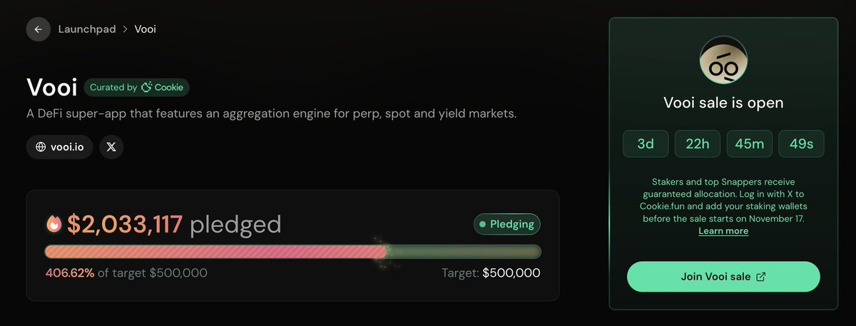 The wait’s finally over Cookie Launchpad is live 🍪 This isnt your typical Web3 launchpad. Cookie is building a whole new MarketingFi world where creators, users, and brands actually share the value Here’s why I am excited about it: • It rewards real people, not bots • Brands connect directly with their audiences • Creators can earn from real impact, not vanity metrics • And $COOKIE keeps the whole system growing together cookie isnt about ads its about proof of participation and real community power And with @vooi_io as the first project to launch, you can tell Cookie not here to experiment they are here to build for the next cycle. Feels like the start of something big.