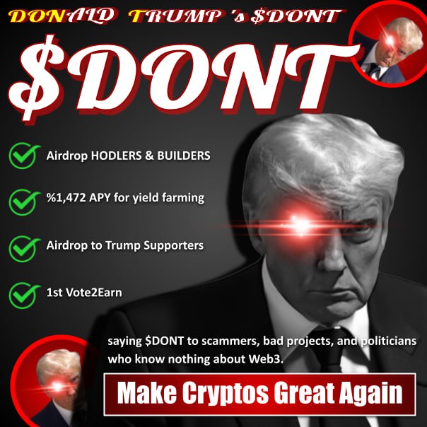 大选将至,这是改变历史的时刻,之前的官推因特殊原因被风控,信仰永不变关注新官推@DONT_maga强大的力量支持特朗普,无论最终结果如何,自由永不过时,$DONT为我们打开了潮流之门!成为下一个自由象征,不仅仅是口号,而是行动 。