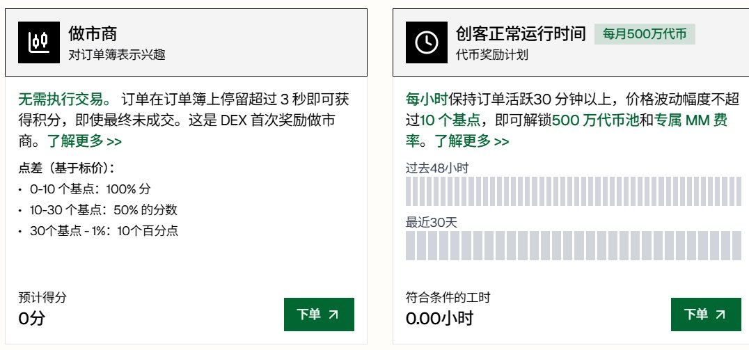 独立的Maker Uptime计划也已上线,每月500万代币奖励池,月度达到360+小时(MM1)或504+小时(MM2),不仅享手续费大折扣,还有maker返佣,躺着提供流动性就有回报。