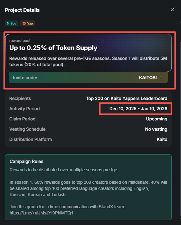 小恐龙温馨提示:@StandX_Official 的 Active Trader 角色1月6日(明天)申请截止,有500积分以上的记得加入官方DC后去填表噢🦖