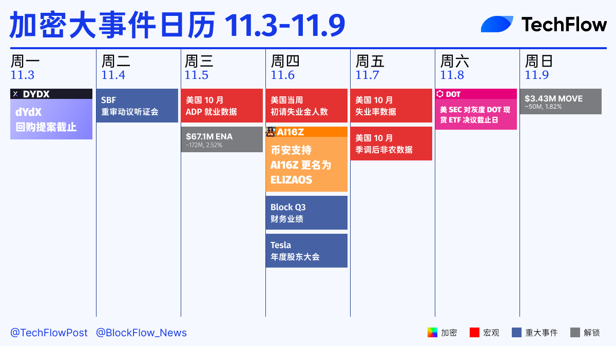 🌐 11月03日-11月09日|本周大事件 📅 11月03日|星期一 🔵 dYdX 社区提案“将 100% 协议费用用于 $DYDX 回购”提交日 📅 11月04日|星期二 🔵 SBF 重审动议听证会 📅 11月05日|星期三 🔴 美国 10 月 ADP 就业人数(万人) 🔵 $ENA 解锁约 1.72 亿枚代币,与现流通量的比例为2.52%,价值约 6710 万美元 📅 11月06日|星期四 🔴 美国至 11 月 1 日当周初请失业金人数 🔵 币安 Alpha 及币安合约支持 $AI16Z 代币更名为 $ELIZAOS 🔵 Block Inc 发布 Q3 财务业绩 🔵 特斯拉(TSLA.O)举行年度股东大会 📅 11月07日|星期五 🔴 美国 10 月失业率 🔴 美国 10 月季调后非农就业人口(万人) 📅 11月08日|星期六 🔵 美国 SEC 对灰度 $DOT 现货 ETF 做出决议截止日期 📅 11月09日|星期日 🔵 $MOVE 解锁 5000 万枚代币,与现流通量的比例为 1.82%,价值约 343 万美元