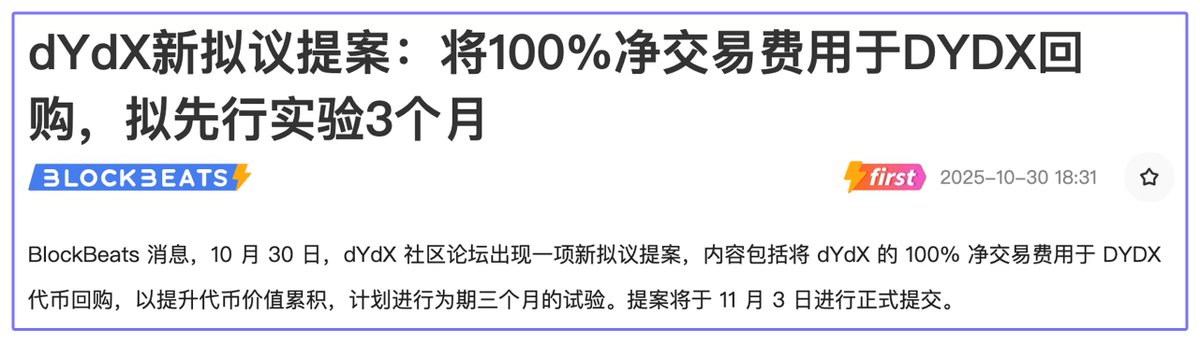正向飞轮:手续费回购代币,再用代币进行补贴! 或许不少小伙伴还没注意到,早在 2025 年 4 月,dYdX 就宣布:启动为期 9 个月、总奖金高达 2000 万美金的交易奖励计划。 在最新的赛季(11 月的 S8)的提案中奖励依旧是价值 100 万美金的 DYDX 代币,每周 25 万美金。 但重点是奖励机制的改革:将从单一的交易激励,逐步迈向更全面的社区驱动生态。 🤔 提案的核心方向可以归纳为: 1️⃣ 基本盘:不再局限于交易,更强调整体活跃度与贡献度。 2️⃣ 优化改进:提升治理参与奖励,鼓励更多人投票、讨论、发起提案。 3️⃣ 社区活跃与市场推广:开发者(小工具)、内容创作者(嘴撸)、教育者(教程)等角色同样能够获得激励。 ⚒️ 对应的参与角度则是: 1️⃣ 交易者:依旧能通过活跃交易获得奖励,但不再只是比拼交易量(通过 API 交易无法获得活动奖励)。 2️⃣ 治理参与者/持币者:S8 中治理参与的奖励权重更高,因此需要积极参与提案讨论,哪怕是建设性的评论也可能计入贡献。同时要保持持续投票,避免 "一次投完就躺平"。 3️⃣ 开发者/建设者:生态贡献同样被纳入奖励范围。 - 开发者可以尝试制作数据看板(如 DUNE)或小工具并分享; - 拥有社媒账号的,可以积极产出教程、分析文章或视频; - 此外,活跃在论坛或社区展示贡献,也会被认可。 顺应这一提案方向,最佳策略显然是多维度参与(交易 + 治理 + 社区贡献),而不是单点突破。 dYdX 已经意识到,在当前 Perp 的激烈竞争中,仅靠交易内卷,已难以让老树抽出新芽。 不过,通过奖励机制的改革,让其在市场中重新发声,并进一步激活社区,无疑是一条值得肯定的路径。 与此同时,昨天 dYdX 又提出了一项新提案:计划将平台 100% 的净交易费用于 $DYDX 代币回购,以增强代币价值累积,并进行为期三个月的试验。 该提案预计将在 11 月 3 日正式提交,虽然尚未通过,但大概率只是时间问题。 正向飞轮:手续费回购 DYDX 代币,再用 DYDX 代币进行补贴,可持续性的烧钱补贴! —— Perp 大战仍在继续,老兵 dYdX 再度请战~ 提示:以上仅为信息分享,非投资建议,请务必自行做好研究! 薅羊毛的 DeFi 爱好者:BitHappy