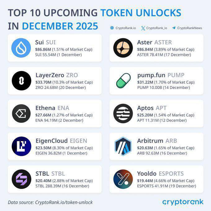 JUST IN : 🚨🚨 $1.8B in tokens including $SUI, $ASTER, $ZRO, $PUMP, $ENA, $APT, $EIGEN, $ARB, $STBL and $ESPORTS is set to unlock in December.