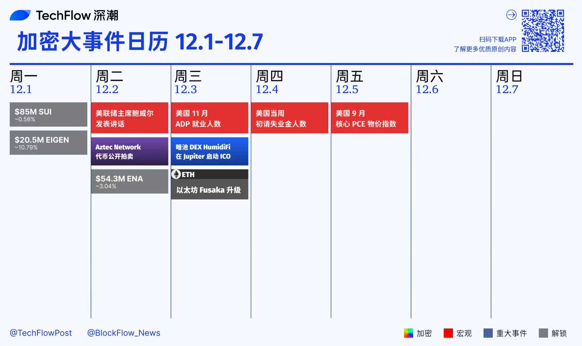 🌐 12月01日-12月07日|本周大事件 📅 12月01日|星期一 🔵 $SUI 解锁 5554 万枚代币,价值约 8500 万美元,占流通量 0.56% 🔵 $EIGEN 解锁约 2050 万美元的代币,占流通量 10.79% 📅 12月02日|星期二 🔴 美联储主席鲍威尔在一场纪念活动中发表讲话 🔵 @aztecnetwork 启动 $AZTEC 代币公开拍卖 🔵 $ENA 解锁价值约 5430 万美元的代币,占流通量 3.04% 📅 12月03日|星期三 🔴 美国 11 月 ADP 就业人数 🔵 暗池 DEX @humidifi 在 Jupiter 启动 ICO 🔵 以太坊进行 Fusaka 升级 📅 12月04日|星期四 🔴 美国至 11 月 29 日当周初请失业金人数 📅 12月05日|星期五 🔴 美国 9 月核心 PCE 物价指数年率/月率