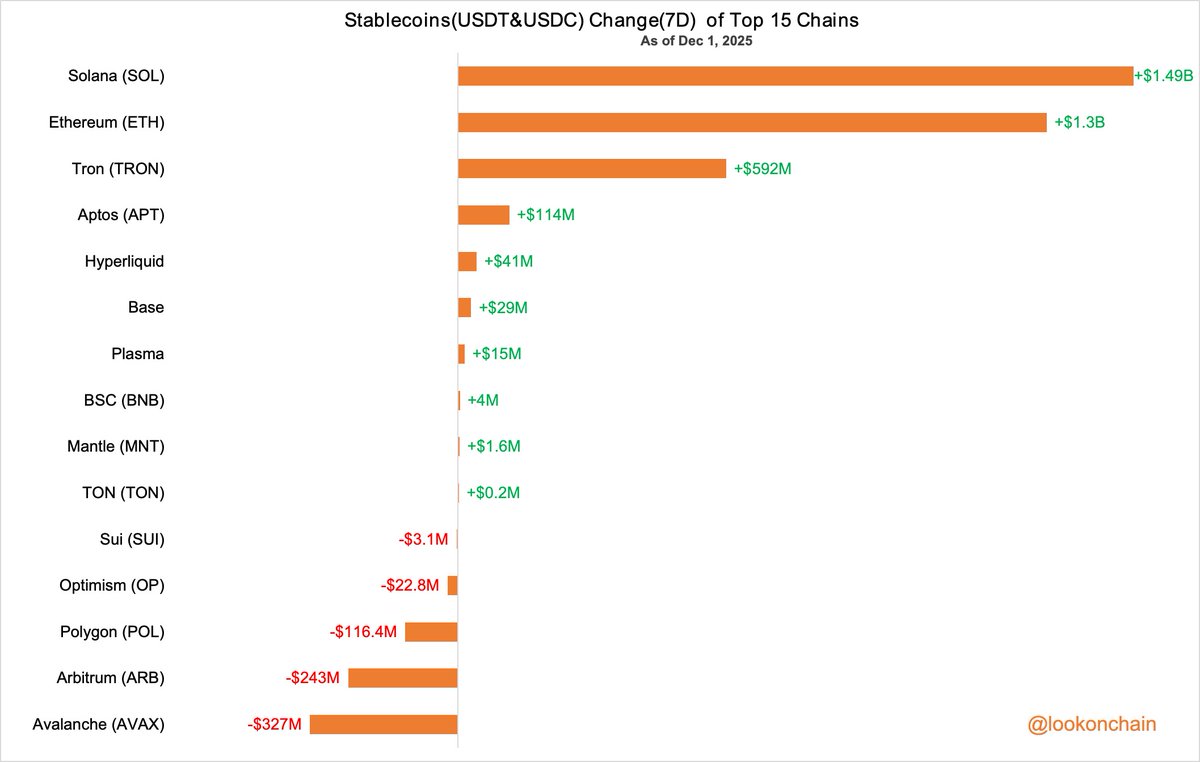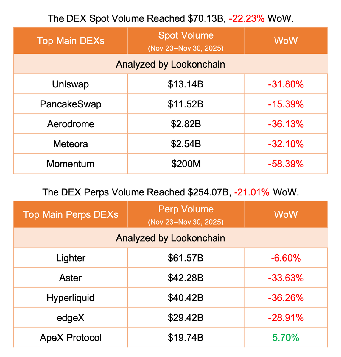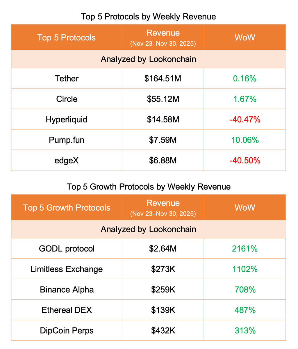 Nov 24–Nov 30, 2025 #LookonchainWeeklyReport The crypto market weakened this week, with major assets down and trading activity cooling across both spot and perp markets. Stablecoin flows and institutional accumulation remained steady despite the overall decline. 🟢 Stablecoin Market The total stablecoin market cap increased by $3.26B. 🟢 Spot & Perps Trading Volume on DEXs 🟢 Protocol Revenue 🟢 Last week, a total of 9 public companies increased their holdings by 734.41 BTC ($62.2M). 🟢 Institutional/Whale Activity Tom Lee(@fundstrat)'s #Bitmine bought 96,798 $ETH($273M) last week and currently holds 3,726,499 $ETH($11.52B). https://t.co/PoiY9Fqb5G Arthur Hayes bought 4.89M $ENA($1.37M), 436,000 $PENDLE($1.13M), and 696,000 $ETHFI($543K). https://t.co/YaUtgluK9B An #Ethereum ICO participant sold 20,000 $ETH($58.14M). https://t.co/YIrG3vIbfo