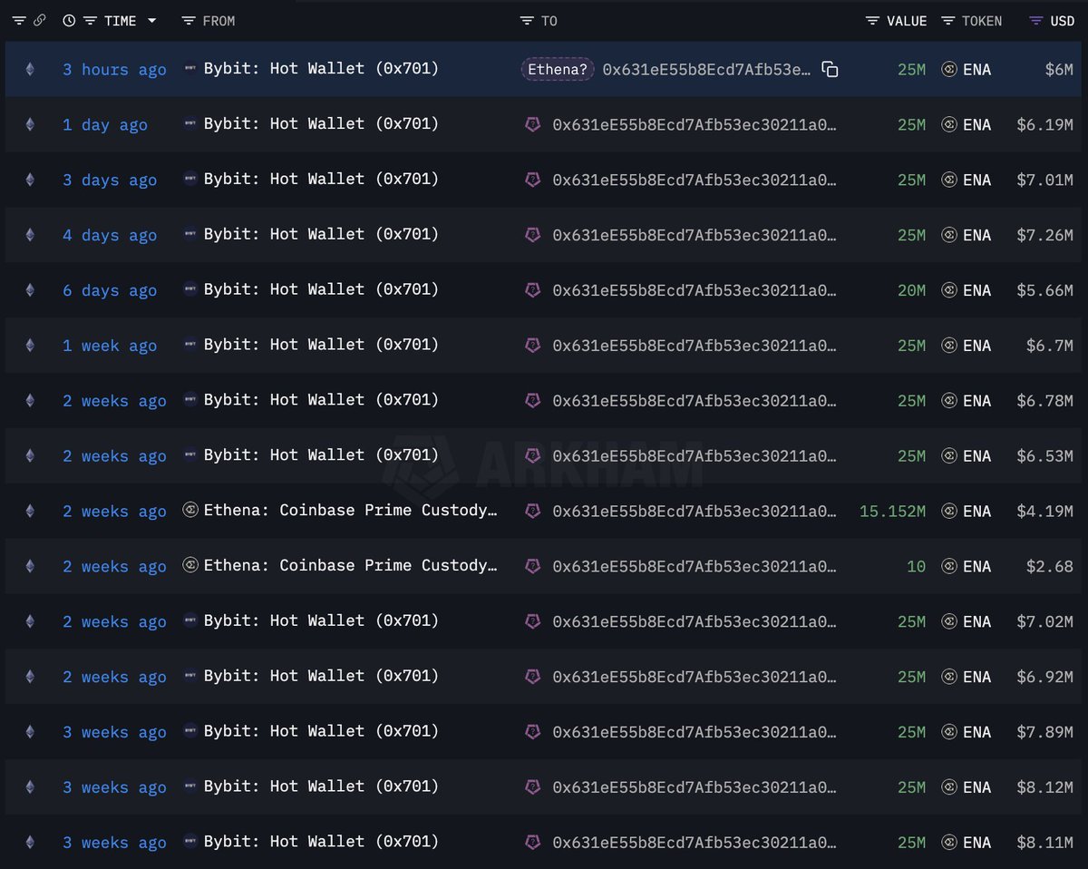 Wallet 0x631e( linked to @ethena_labs) withdrew another 25M $ENA($6M) from #Bybit 3 hours ago. This wallet has withdrawn a total of 405.15M $ENA($96.8M) from Bybit and Coinbase Prime since Nov 7.