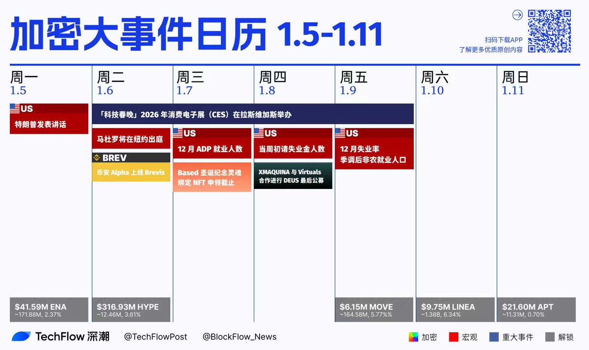 🌐 1 月 5 日 - 1 月 11 日|本周大事件🪄 📅 1 月 5 日|星期一 🔵 美国总统特朗普发表讲话(8:30) 🔵 $ENA 将于 1 月 5 日解锁 1.7188 亿枚代币,价值约 4159 万美元,占流通量 2.37% 📅 1 月 6 日|星期二 🔵 美国法院确认马杜罗将于北京时间 6 日 1 时在纽约出庭 🔵 “科技春晚”2026 年消费电子展(CES)开幕,为期三日 🔵 币安 Alpha 上线 Brevis(BREV) 🔵 $HYPE 将于 1 月 6 日解锁 1246 万枚代币,价值约 3.1693 亿美元,占流通量 3.61% 📅 1 月 7 日|星期三 🔵 美国 12 月 ADP 就业人数(万人) 🔵 Based 圣诞纪念灵魂绑定 NFT 申领截止 📅 1 月 8 日|星期四 🔵 美国至 1 月 3 日当周初请失业金人数(万人) 🔵 XMAQUINA 与 Virtuals 合作进行 $DEUS 最后公募 📅 1 月 9 日|星期五 🔵 美国 12 月失业率 🔵 美国 12 月季调后非农就业人口(万人) 🔵 $MOVE 将于 1 月 9 日解锁 1.6458 亿枚代币,价值约 615 万美元,占流通量 5.77% 📅 1 月 10 日|星期六 🔵 $LINEA 将于 1 月 10 日解锁 13.8 亿枚代币,价值约 975 万美元,占流通量 6.34% 📅 1 月 11 日|星期日 🔵 $APT 将于 1 月 11 日解锁 1131 万枚代币,价值约 2160 万美元,占流通量 0.70%