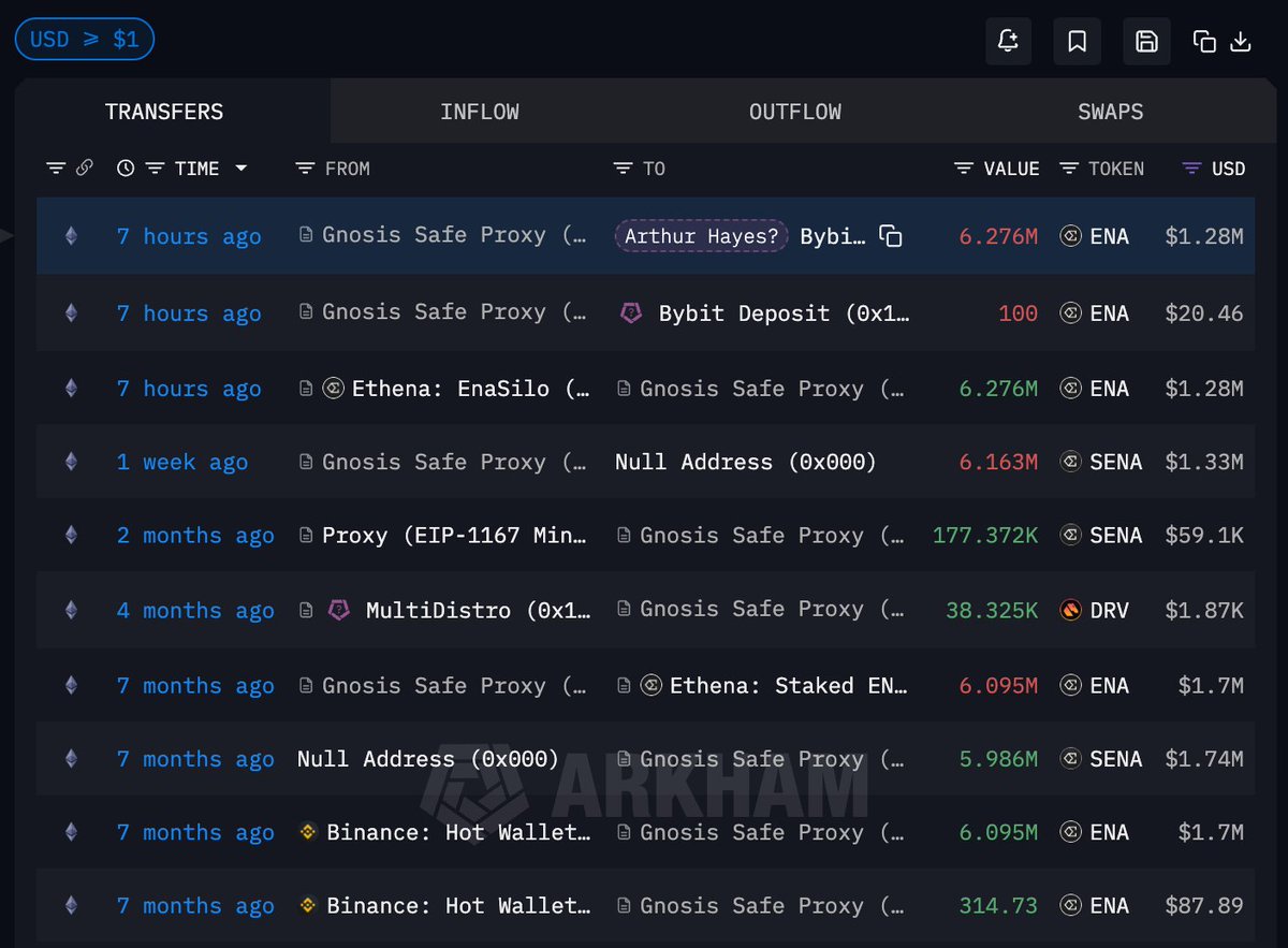 小黑 Arthur Hayes 是真狗啊 昨晚刚在采访中提到2025年最佳投资 分别是 $zec $hype $ena 下了采访立马把价值130万的 $ena 冲到了bybit 这是一遍喊单一边出货吗? 我咋感觉这比印堂发黑呢