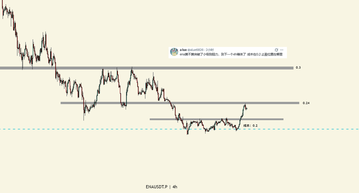 3/5 $ENA 的上方TP 目前TP1:0.24 已经到了,距离你的 0.2 成本也有 20% 左右了。下一个大阻力 应该是在 0.3 区域这块。 本文由 @Bitget 赞助|Bitget VIP,费率更低,福利更狠