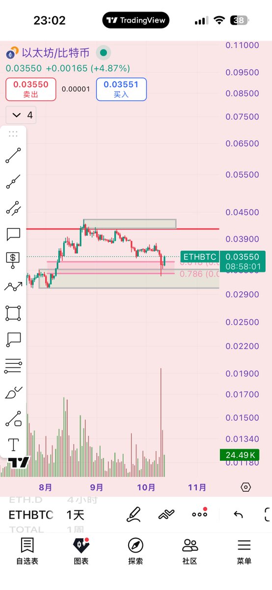 1) 汇率的低点就是 ETH 回踩这 1384 的位置,这个后边 ETH 图时讲 。