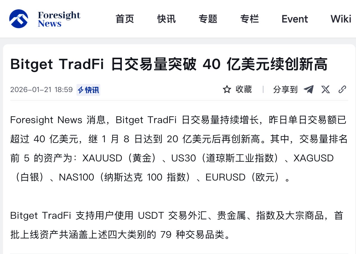 今天,白银触及 95.85 美元,续创历史新高,连续 9 个月维持上涨趋势。在 #Bitget ,TradFi 交易量持续增长,昨天单日超过40亿美元。