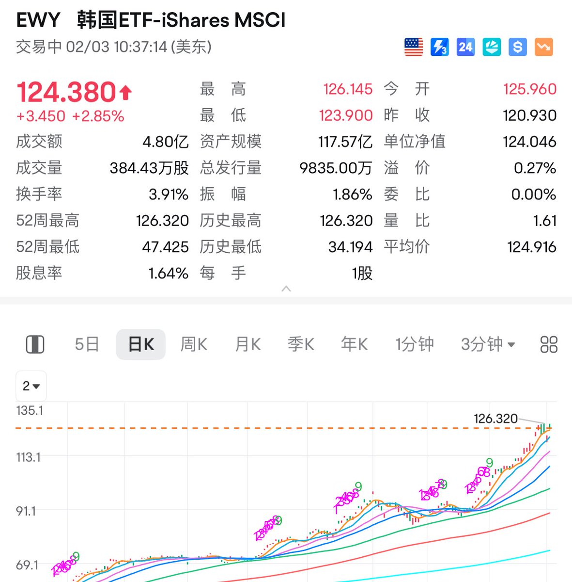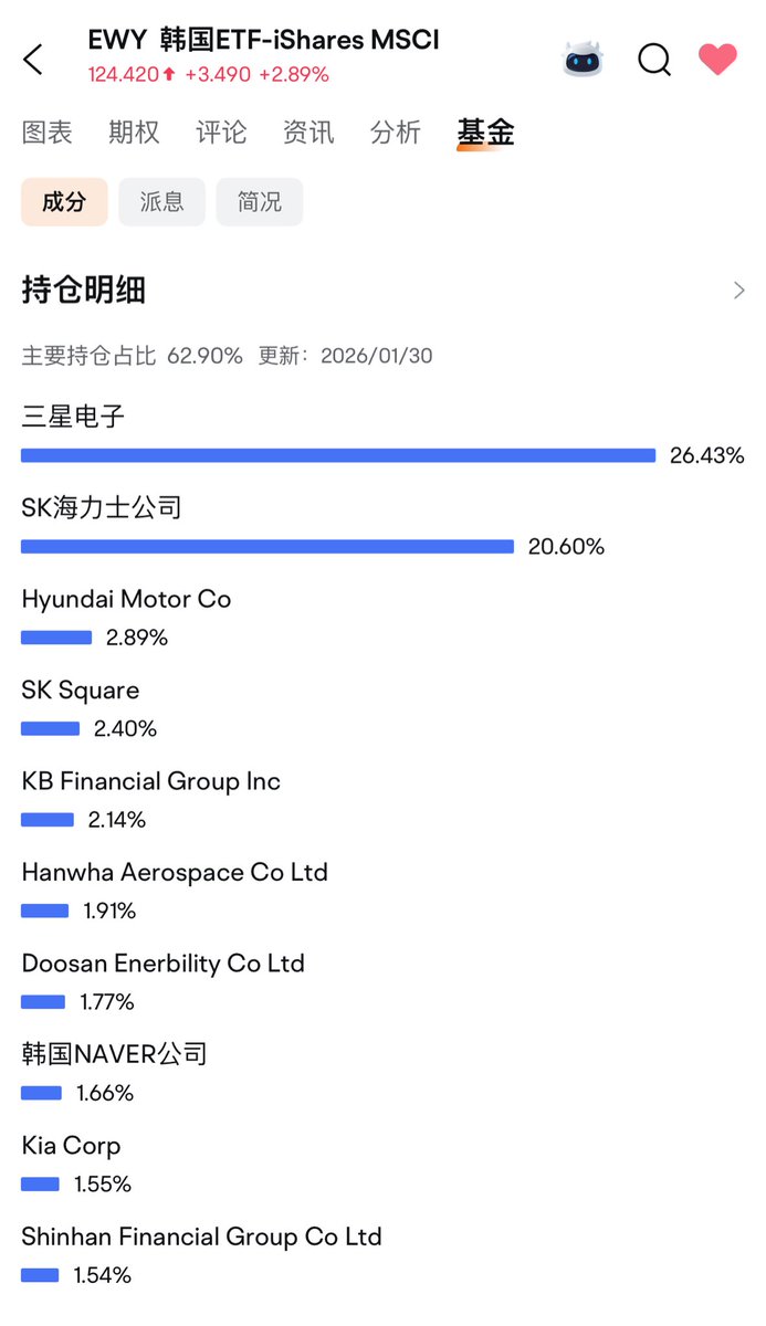 把抄的白银slv卖了换了韩国etf指数 $EWY 均价被抬高到了122.6美金. 包含46.4%三星和海力士.