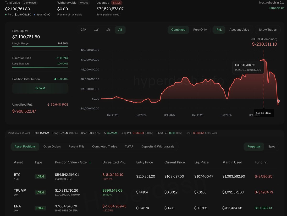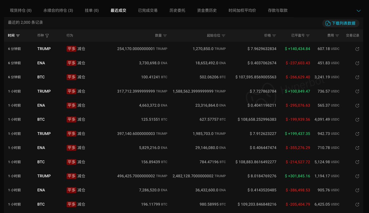 地址 0xf35...1fb59 的 40x $BTC 和 10x $ENA 多单已在过去 1 小时内遭遇 4 次强平减仓,累计亏损 216 万美元,好在 TRUMP 多单是盈利的还能回些血