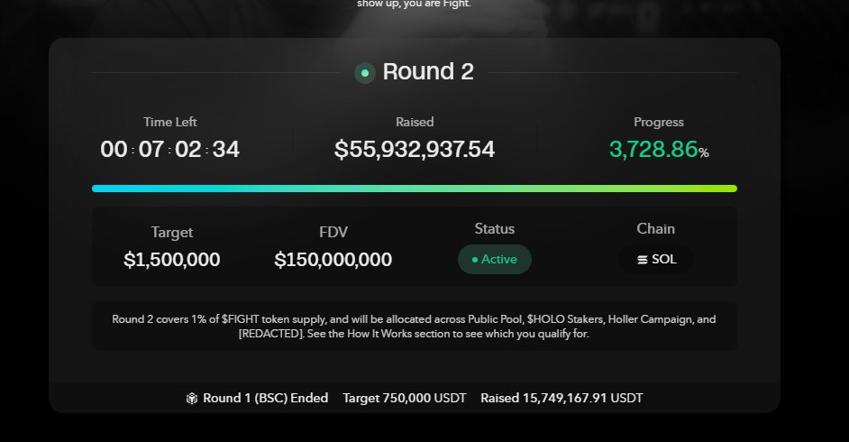 说出来你们可能不信 $FIGHT 二期原本就打算募150万美元,结果超了122倍,最后硬生生收了1.83亿美金