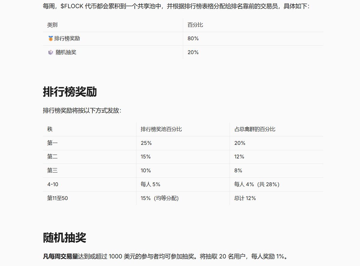 4、 $FLOCK 代币奖励每周计算一次, 排行榜奖励80%,随机抽奖20%(需要每周交易量 ≥ $1,000 )