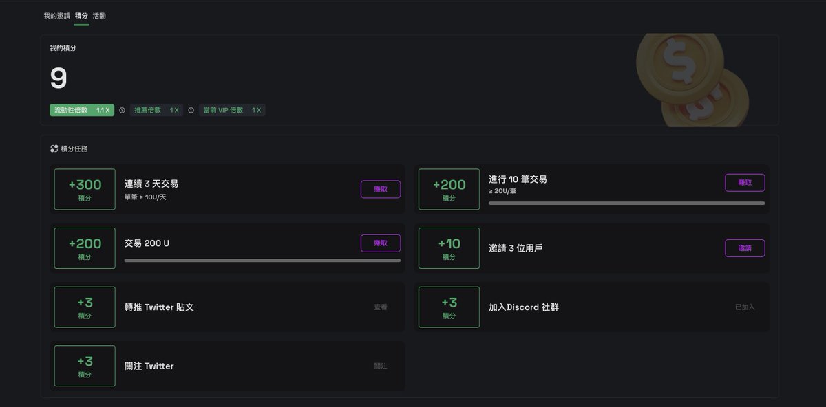 ·平台会有一些简单的社媒关注任务可以拿加分。