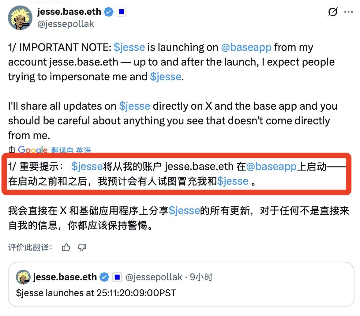 Base创始人jesse 宣布要发自己的同名代币,11月21号凌晨1点发