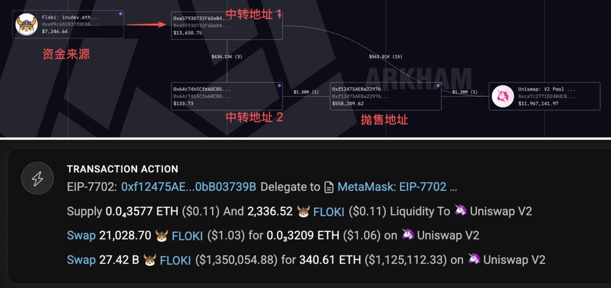 地址 0xf12…3739B 1 小时前在链上卖出 274 亿枚 FLOKI 换得 340.61 ETH,价值约 135 万美元;向前追溯代币资金来源,发现是 Floki 部署地址在三年前分发至地址 0xa57…99c19,又通过 0x64c…95527 二次中转获得