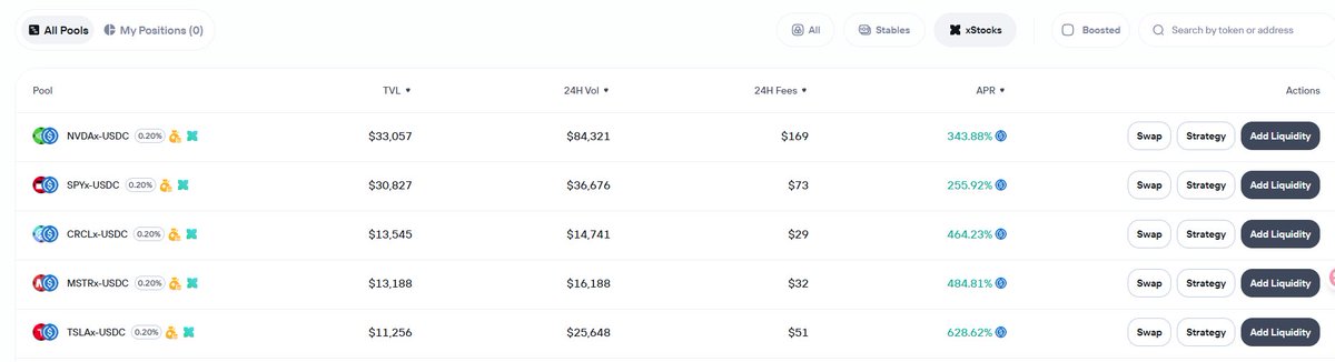 不仅如此,Byreal 早期已与合规平台 xStocks 合作,开放特斯拉、苹果等美股代币化交 易,从「纯加密资产」扩展至「传统金融+加密」,目前还为 $SPYx, $TSLAx, $NVDAx, $MSTRx, $CRCLx 提供了1W UDSC的LP奖励,看了下当前的年化实在太高了!