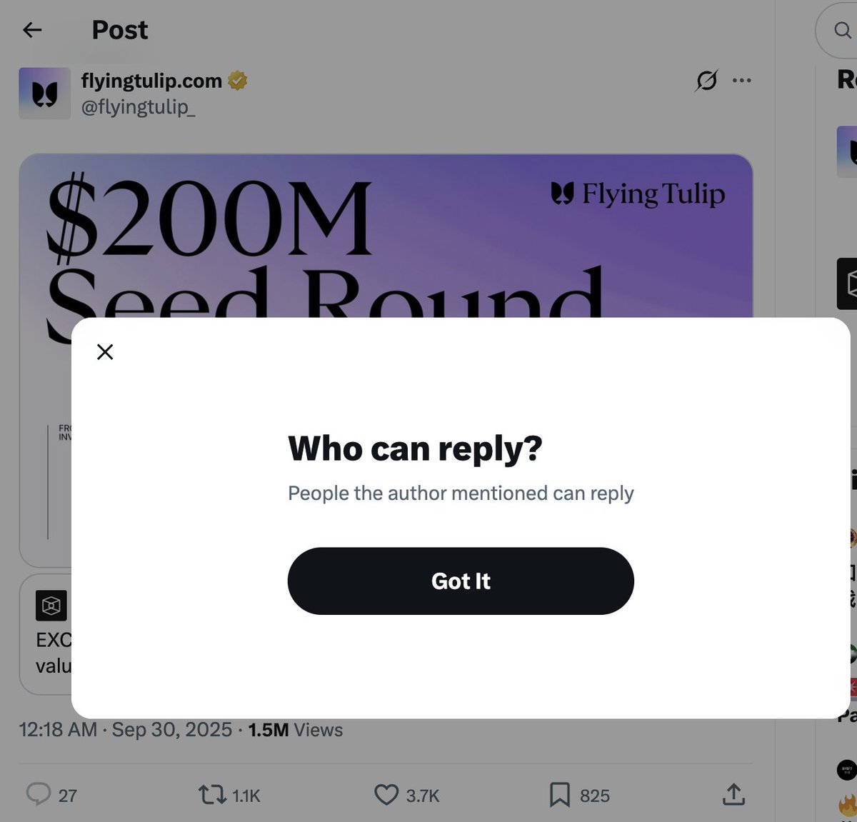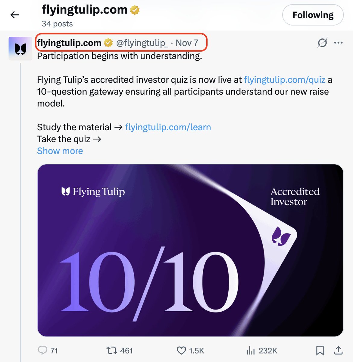 我认为AC 估值10亿美元的新创业盘 @flyingtulip_ 会中道崩殂、胎死腹中并非毫无根据: 1/ @flyingtulip_ 官推已经有近一个月时间没发布推文了,上一条原创推文发布时间定格在11月7日; 2/ 评论区已关闭,限制评论。 非常非常不好的迹象。