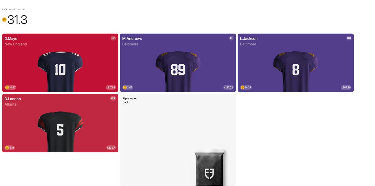 第一轮比赛后收获 646 TP,今天豪掷 500 TP 打开首个 NFL EPIC Pack,直接爆出价值 31.3U 球员股份!