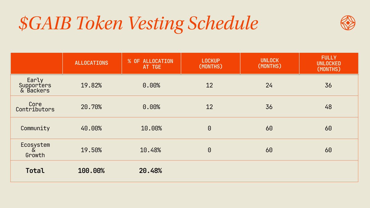 【GAIB Foundation & GAIB Token 正式官宣!!!🪂】 GAIB(@gaib_ai)今日正式宣布 GAIB 基金会 以及即将上线的 GAIB 代币经济模型。 📘 完整 Tokenomics 信息: https://t.co/QZeyw2K7QS 🔥 查询你的 GAIB Spice: https://t.co/bgEBYblWT4 这里是简要概览: 代币符号: $GAIB 总代币量:10 亿枚 其中 40% 的代币将分配给社区,用于支持 空投、质押奖励和用户参与计划。 社区分配中有 10% 会在 TGE 解锁,因此初始空投的数量大概率会接近这个额度。 目前 TGE 日期 和 空投查询页面开放日期 尚未公布。 持有 GAIB Spice 点数 以及 Fremen Essence NFT 的用户,很可能会获得空投资格,等待进一步官方信息。