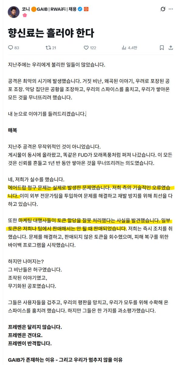 이번주에 올라온 GAIB CEO 장문의 트윗 * 주요 이슈 관련 요약 1. 에어드랍 물량 팀이 꿀꺽했다가 걸린거 - 우리가 기술적인 오류로 실수한거임 ㅇㅇ - 문제 해결중임 ㅇㅇ 2. 내부자 의심 물량 대량 덤핑 - $GAIB 우리가 던진거 아님 ㅇㅇ - 마케팅 대행사 (에이전시, 인플루언서)들이 던진거임 ㅇㅇ - 걔들이 계약 위반하고 불법으로 던져서 우리가 아직안팔린 토큰 회수하고 바이백 하고있음 ㅇㅇ 이후 내용은 계속 FUD 들 다 구라, GAIB 최고, 저는 가난한 집안에서 태어났어요, 빌더로서의 숭고한 길, 멈추지 않고 킵빌딩.. 이런 내용들 💬 근데 진짜 팀이 아니라 마케팅 대행 에이전시, 인플들이 계약 위반하고 불법으로 풀매도친거면, 해당자/회사들 공개하고 법적 대응하는게 맞지 않나..?