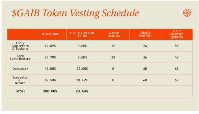 11 月 19 日 币安 Alpha $GAIB 项目分析: 一、项目介绍: @gaib_ai是一个通过代币化企业级GPU将AI计算收益转化为可交易DeFi资产的区块链平台,发行AID稳定币和sAID质押代币实现AI基础设施与DeFi的融合。 二、代币模型: 代币总量:10亿 初始流通:2.04亿(20.48%) 上线时间:11 月 19 日 18:00 币安合约:11 月 20 日 17:00 项目融资:1500万美元 鸣人评级:★ ★ ★ ☆ ☆[综合感受,非权威评级] BSC 合约:0xc19d38925f9f645337b1d1f37baf3c0647a48e50 三、代币经济学: ▶️︎社区:40% (TGE 10%,剩余90%线性释放60个月) ▶️︎团队:20.7% (TGE 0%,12个月锁定后36个月线性释放) ▶️︎机构:19.8% (TGE 0%,12个月锁定后24个月线性释放) ▶️︎生态:19.5% (TGE 10.48%,剩余线性释放60个月) 四、筹码分析: * 18:00 币安 Alpha 预计 1% * 17:00 社区10%的具体分配和空投检查器将于在官推公示 五、融资详情: * 种子轮,500万美元,战略轮,1000万美元, * 分配19.8%,成本约0.0757U 六、收益预估: *盘前价0.25U左右,对应流通市值5000万,FDV2.4亿 * 池子价0.25U,与盘前一样 * 币安 Alpha 预计先到先得 七、补充 * 该项目有 $AID $SAID 两相关代币,用来1:1美元锚定的稳定币,由美国国债和稳定币全额抵押,可再质押收益。和 $USUAL 相似,同样的套路。 * 前几天大V CBB @Cbb0fe 对其FUD,质疑资金透明度与审核问题,随后CEO Kony @konyk001 也进行了回复,承诺100%兑现,感兴趣的可去对应推号吃瓜 * 行情太差,导致盘前与池子价齐平,流通市值也已经5000万了,主要留意下午5点官推公示空投的详情,