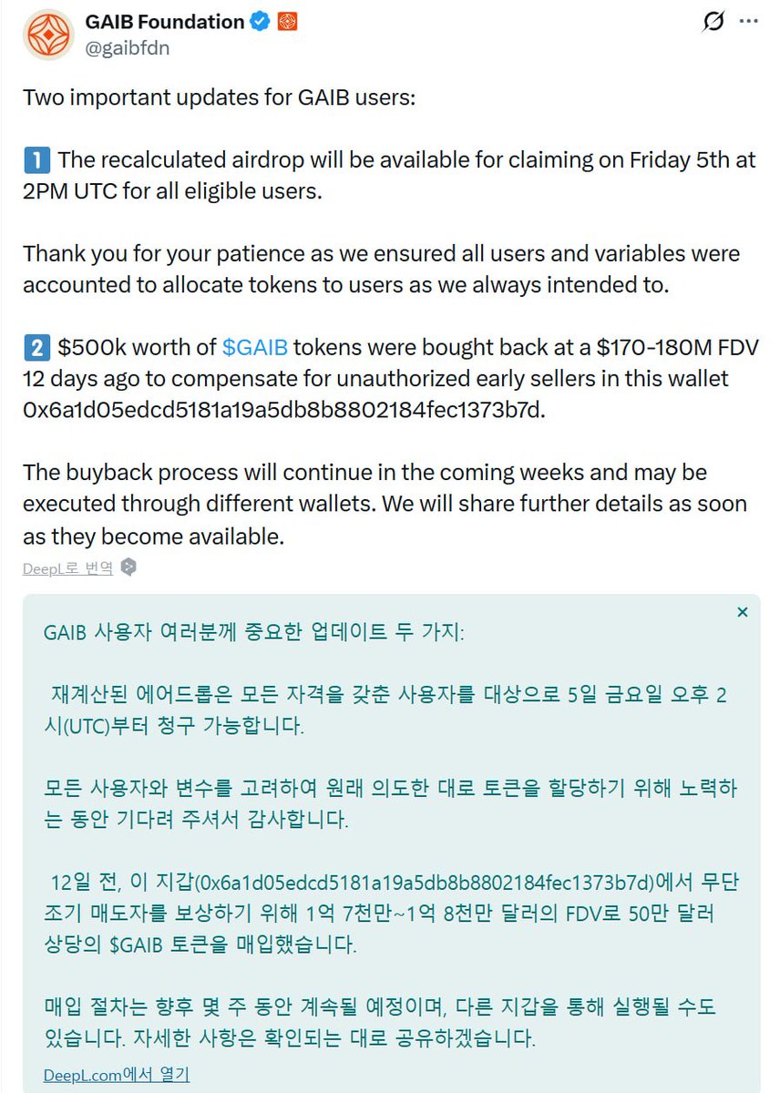 GAIB 업데이트 1. 팀이 꿀꺽했다 걸려서 재계산한 에어드랍은 12/5 23시 KST 부터 클레임 가능 2. 인사이더 매도했다가 걸렸던거 관련해서 2주 전에 $170-180M FDV 가격에 50만 달러 가치의 $GAIB 바이백 했음. 추가 바이백도 진행 예정 * 2주 전에 바이백한 지갑 주소 : 0x6a1d05edcd5181a19a5db8b8802184fec1373b7d