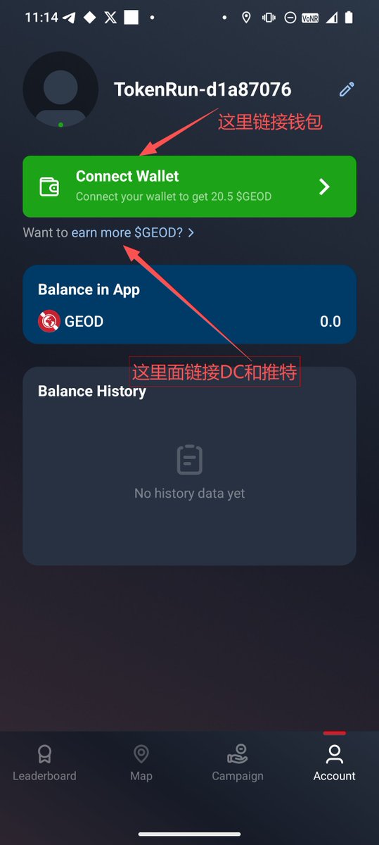🔹继续点击界面上方的“earn more $GEOD”,在里面链接你的DC和推特,都完成可以获得50 $GEOD