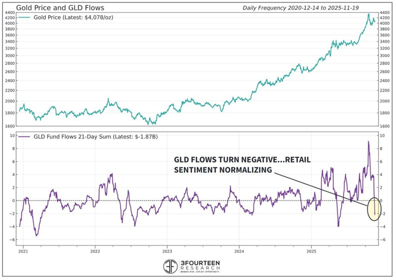 作为最传统避险资产的黄金现在已经出现了“投降”的迹象,截止到本周三的21天数据中,黄金最大的 ETF $GLD 流出了19亿美元,这是五月以后最大的流出,而当时五月的流出以后风险市场包括 $BTC 在内都出现了大幅上涨。