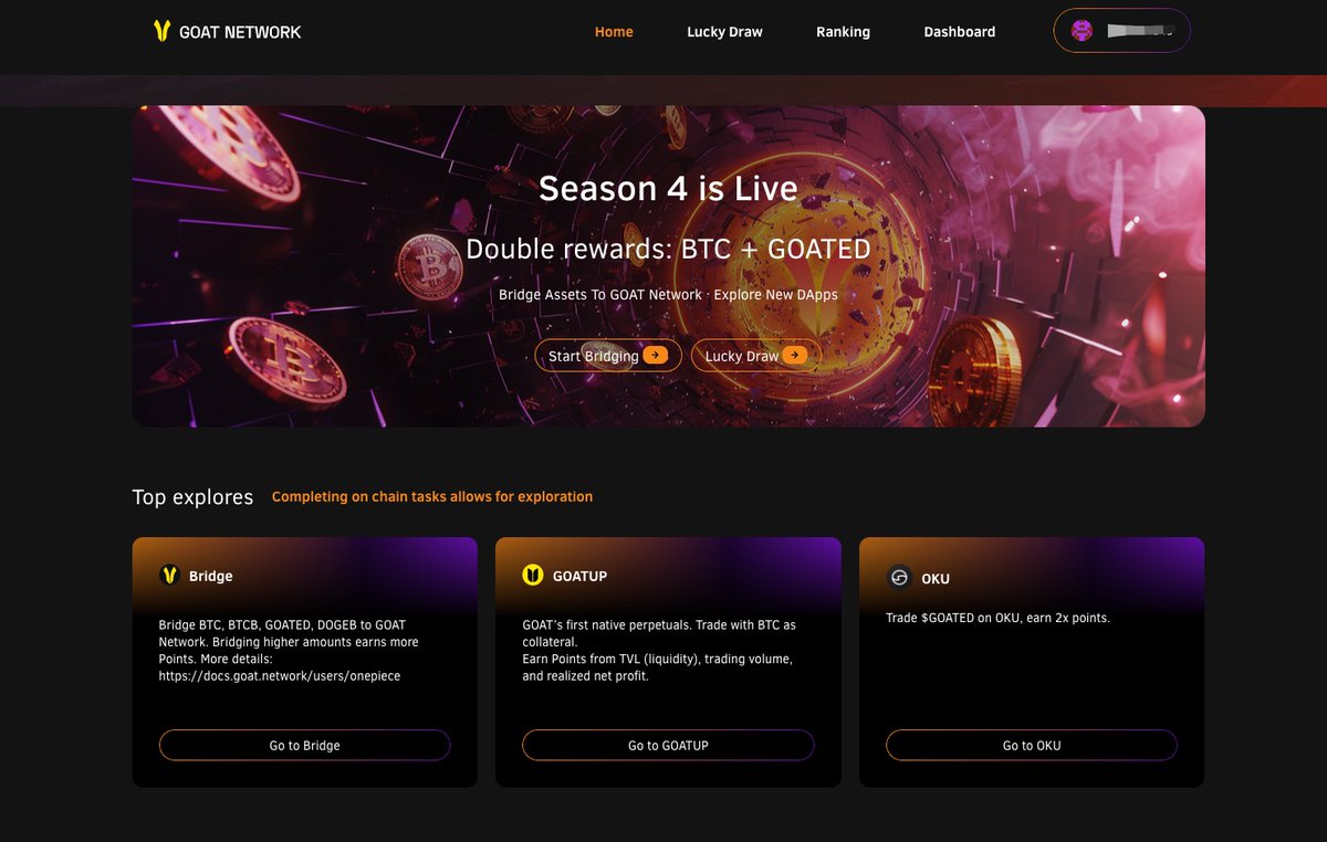 如果你还不知道怎么开始 One Piece 第四季,那我把最简单、最高效的玩法浓缩成一篇教程给你。 第四季上线后的策略:所有动作都围绕积分效率展开。 因为这季的积分,本质上就是通往 BTCFi 奖励的门票。 核心逻辑就三件事: 1⃣每天抽奖 官方规则很简单:每 200 积分 = 1 次抽奖资格(每天最多 100 次) 奖池是真金白银:0.001 BTC、10USDT、1000积分,这是目前成本最低、回报最明确的入口,也是我每天最先做的。 2⃣让积分爆起来的是交易与流动性 如果你只做任务,你永远跟不上一天跑量 5–10 万的用户。但幸运的是,本季的交易积分计算方式很友好: 在 https://t.co/n2ofR7Bbfq:积累 TVL 的时间越长,积分越稳 在 https://t.co/Ndt7hy5TVN:只要交易 $GOATED (现货/永续都算) 积分会随着交易量、利润、TVL 自动累计,不需要很复杂,保持 TVL + 轻量交易,就能稳定吃赛季分。 3⃣跨链也是积分来源 只要把 BTC / BTCB 跨入 GOAT,就能增加赛季参与度与后续奖励权重。跨一次,积分自动入账,不需要你做额外动作。 4⃣最重要的是记得领取 所有积分状态、排名、奖励,都在 https://t.co/rhrsQKGrYI ,这是每天睡前最后点一次的页面。 总结下来就是,做任务拿基础 → 交易赚大头 → 跨链加权重 → Airdrop 页面每天确认进度。 我已经每天抽奖抽到停不下来,你来不来? @GOATRollup #GOATNetwork