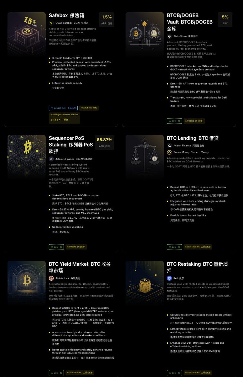 这次更新很有意思 为了鼓励新用户 🪂GOAT Network专门搞了新用户空投: 只要是之前没有在 GOAT 网络上互动的钱包,跨链这些代币超过50美金: BTC、BTCB(BSC)、DOGE(BSC)、USDT(Stargate)、USDC.e(Stargate)、WETH(Stargate) 就可以直接获得对应的BTC空投,BTC 将直接空投到 GOAT 网络的钱包 💰然后就是大家在使用GOAT Network过程中 优先考虑的就是赚钱嘛 那来了,目前可以直接参与BTCFi的方式有6种 1、质押BTC到GOAT 的Safebox,可以拿到保护本金的1.5%的年化收益 注意要锁仓3个月哈 2、参与BTCB/DOGEB的金库可以获得5%的年化收益 3、参与序列器POS质押最高可以获得接近70%的年化收益,而且还不锁仓,我觉得必须要参与 4、BTC的借贷 5、BTC的Yield市场,支持本金保护 6、BTC重质押 我觉得那个收益率最高的可以优先参与 @GOATRollup 官方背书 + 收益率 + 一鱼多吃,很值得 差点忘了,如果你觉得600多万的 $GOATED 流通市值低估的话,也可以买点