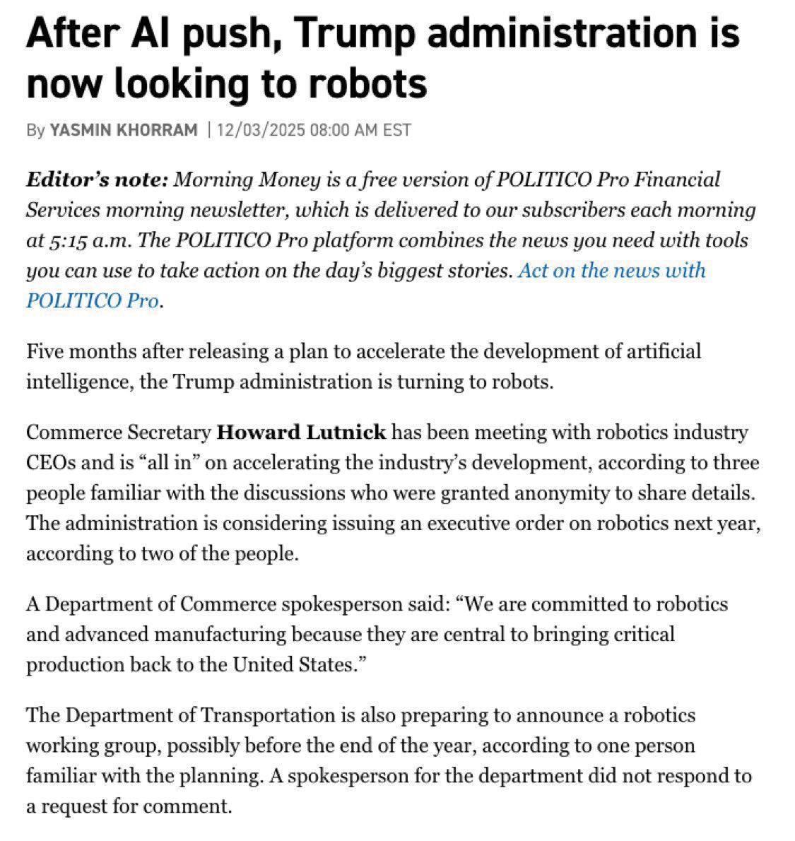 美股机器人产业地图,川普现在把东大的产业政策学的太到位了。11月末刚签署了AI创世纪计划,现在又开始谋划推动机器人产业的发展。看报道商务部长Lutnick最近一直在与机器人行业的CEO们会面,白宫正在考虑发布一项关于机器人技术的行政令,交通部也正准备宣布成立一个机器人工作组,可能在年底前公布。