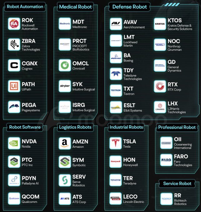 看到这位https://t.co/iEaXtFPeAg梳理的美股机器人产业地图,搬过来。机器人技术正悄然渗透到经济的各个领域: