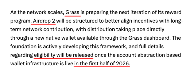现在来说说空投2:它旨在奖励长期贡献者,并将通过即将登陆 Grass 控制面板的全新原生钱包进行分发。空投计划于 2026 年上半年推出,具体时间取决于钱包的准备情况,可能在 1 月至 6 月之间。